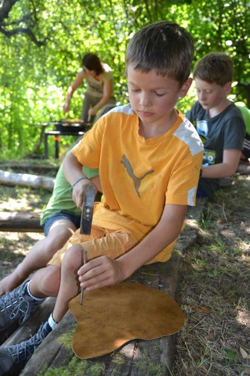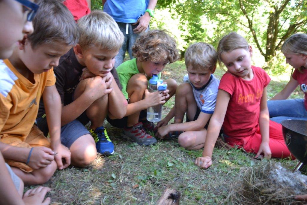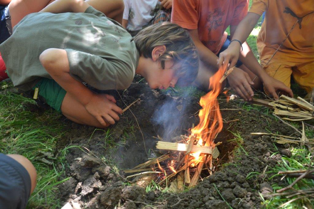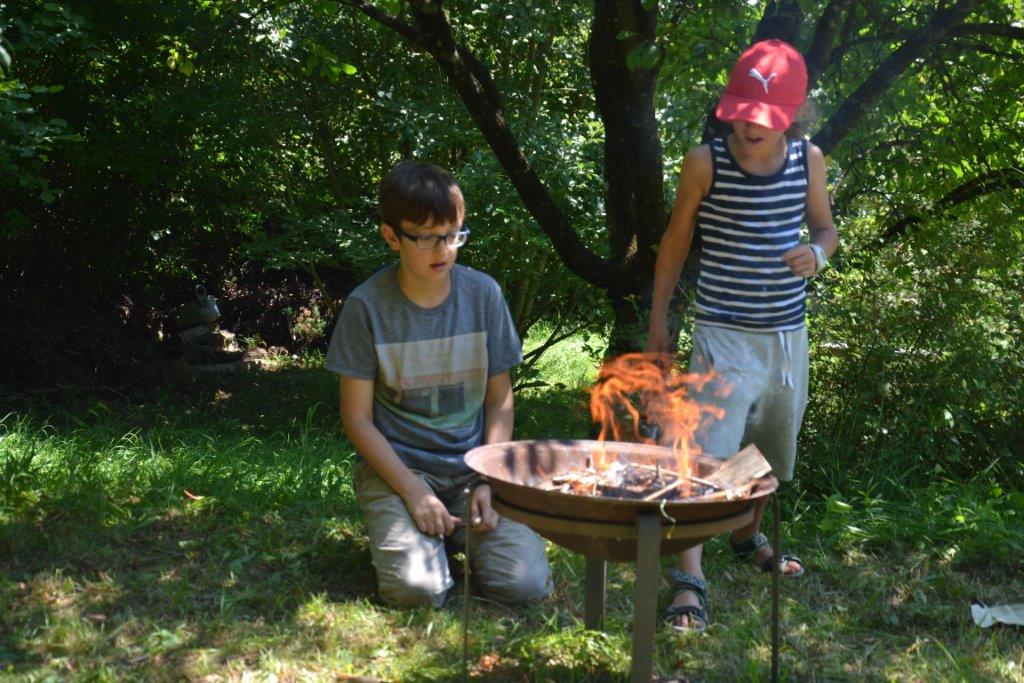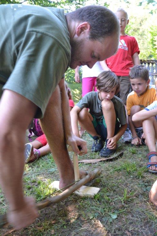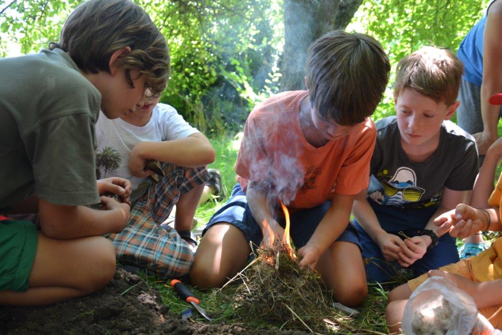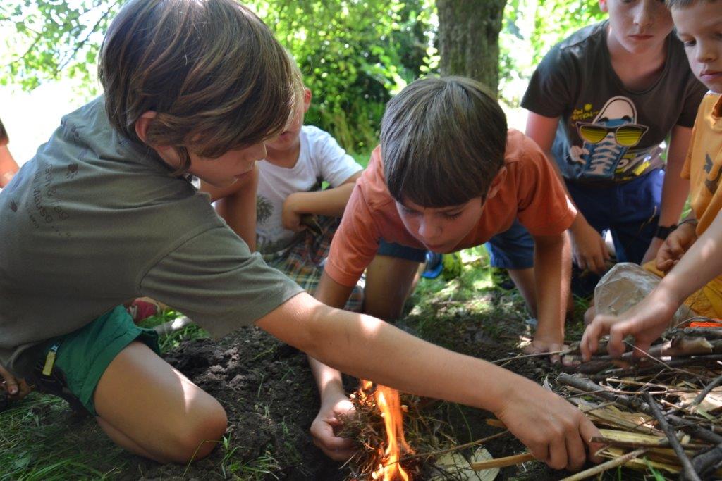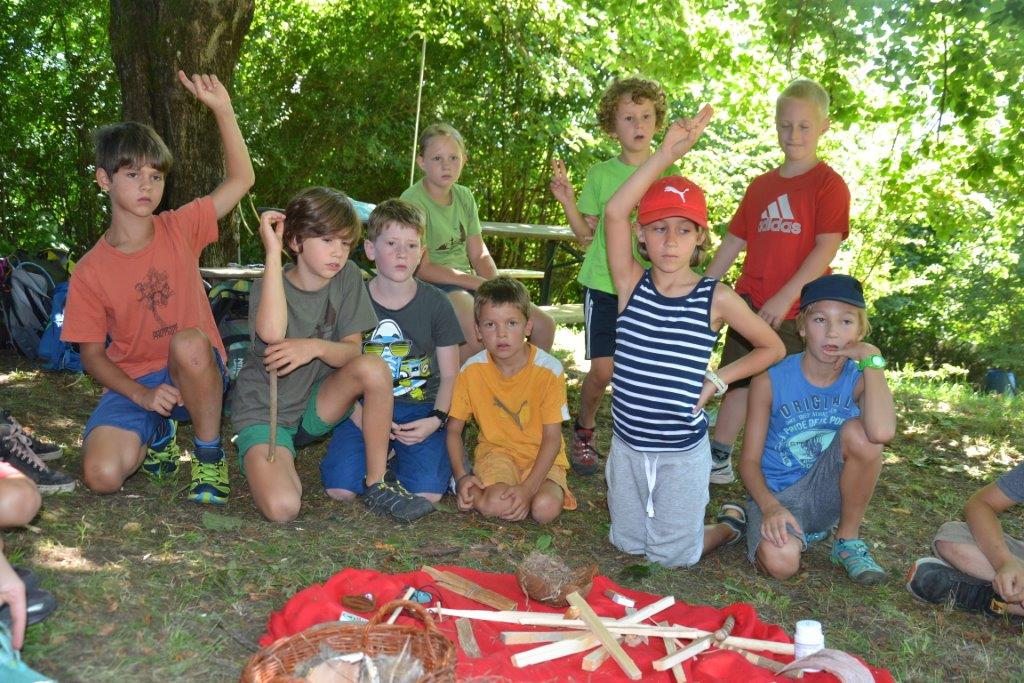 Immerhin hatten sie nur 5 Streichhölzer zur Verfügung, kein Papier oder Pappe, sondern nur Material, das sie selbst in der Natur fanden. Nach einigen Versuchen und Irrtümern schafften es alle, in ihrer Feuerschale ein Feuer zu entzünden. Nicht nur Holz und Zunder, sondern vor allem viel Erfahrung wurde dabei gesammelt. Luca, ein erfahrender Waldläufer, entzündete sein Feuer mit einem Magnesitstab in einer Erdmulde. Mit viel Ausdauer, Konzentration und der Unterstützung von Emil schafften die Jungs auch dieses Feuer zu entfachen. Gekocht wurde natürlich auch mit Hilfe des Feuers und der Gemüseeintopf schmeckte wirklich lecker! Ein Zunderbeutel aus Leder wurde hergestellt und mit selbstgesammeltem Zunder befüllt. Zum Abschluss demonstrierte unser Feuerexperte Christian Prager die Methode mit dem Handdrill. Die Kinder staunten nicht schlecht, wie einfach dies aussah und waren Feuer & Flamme für dieses Element.