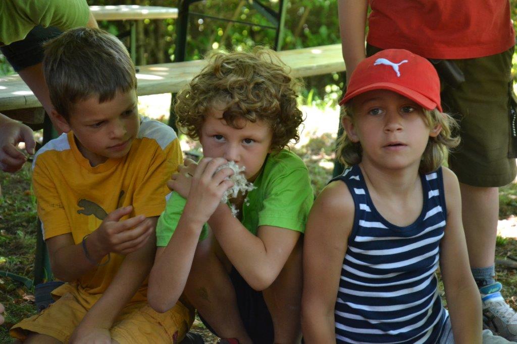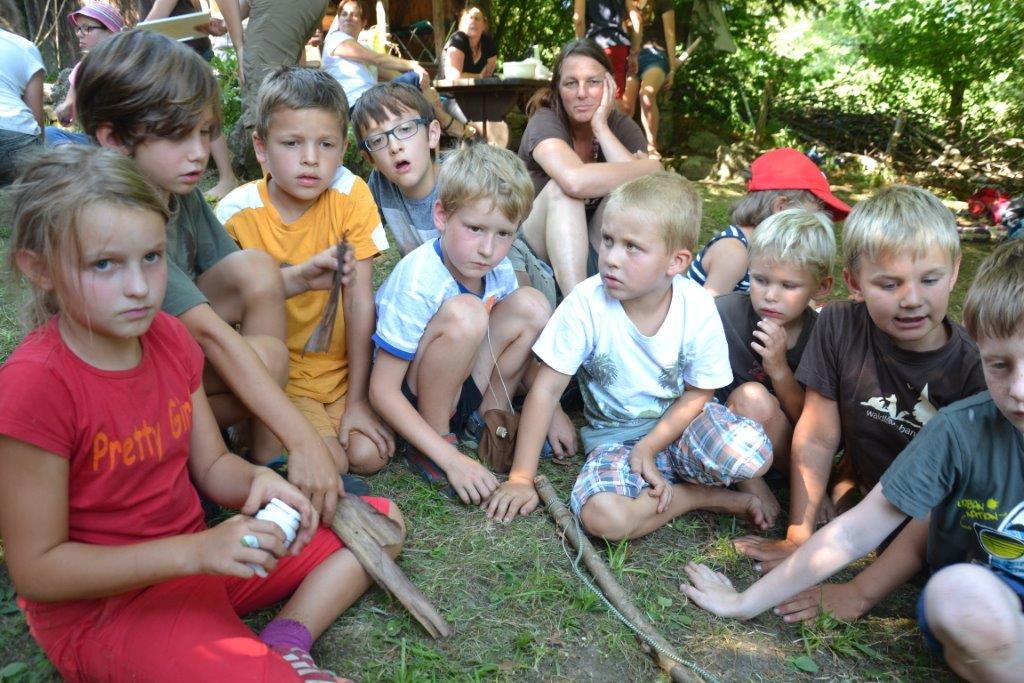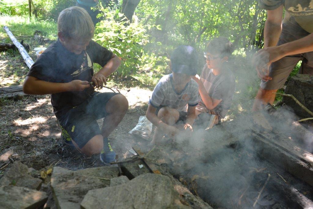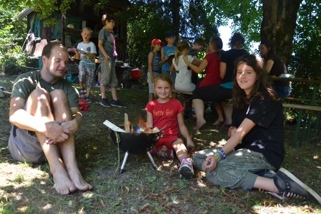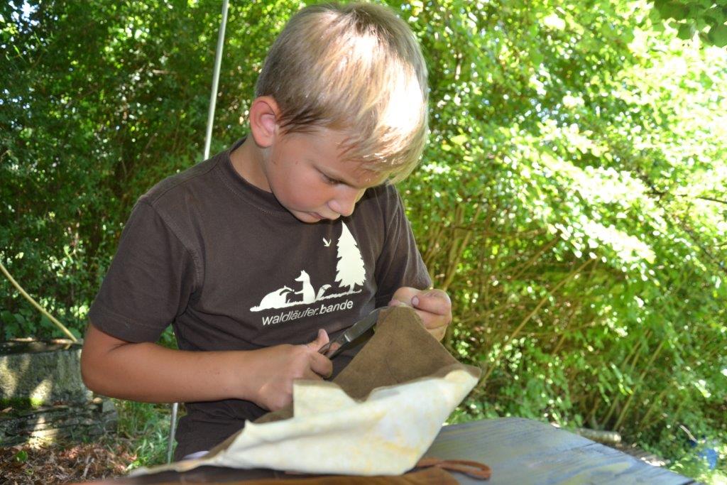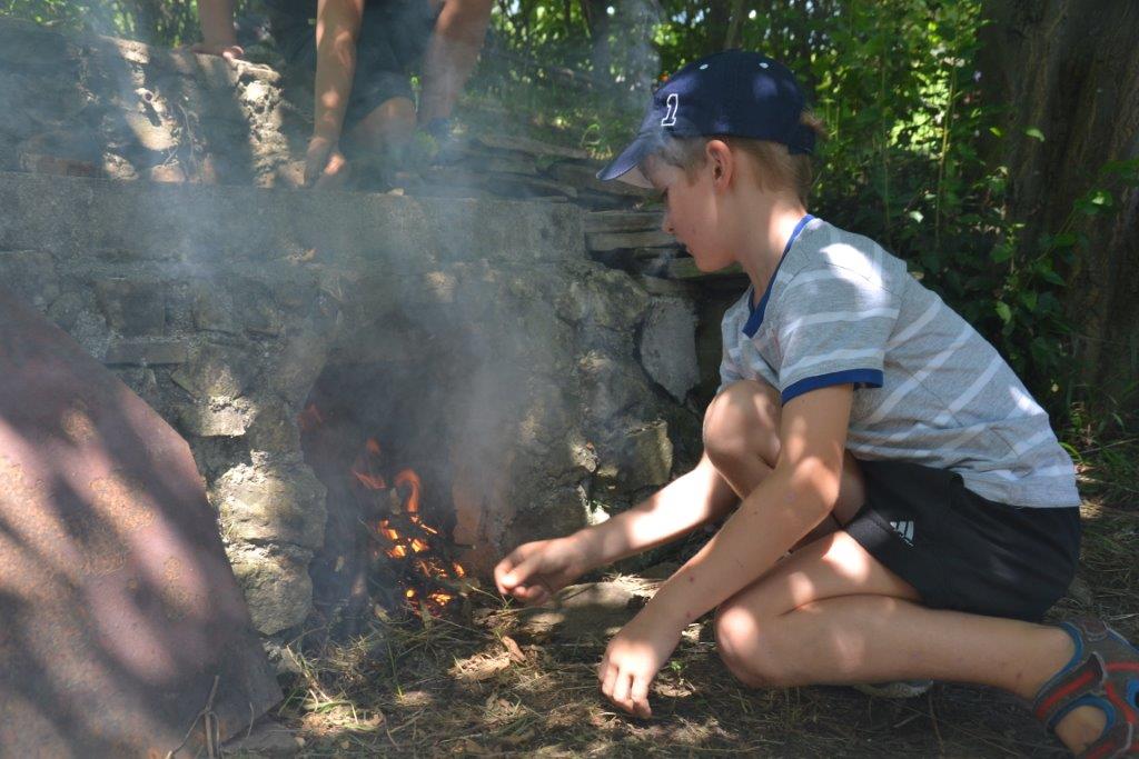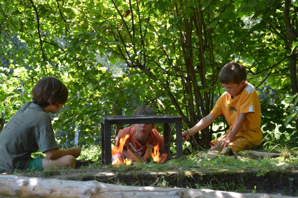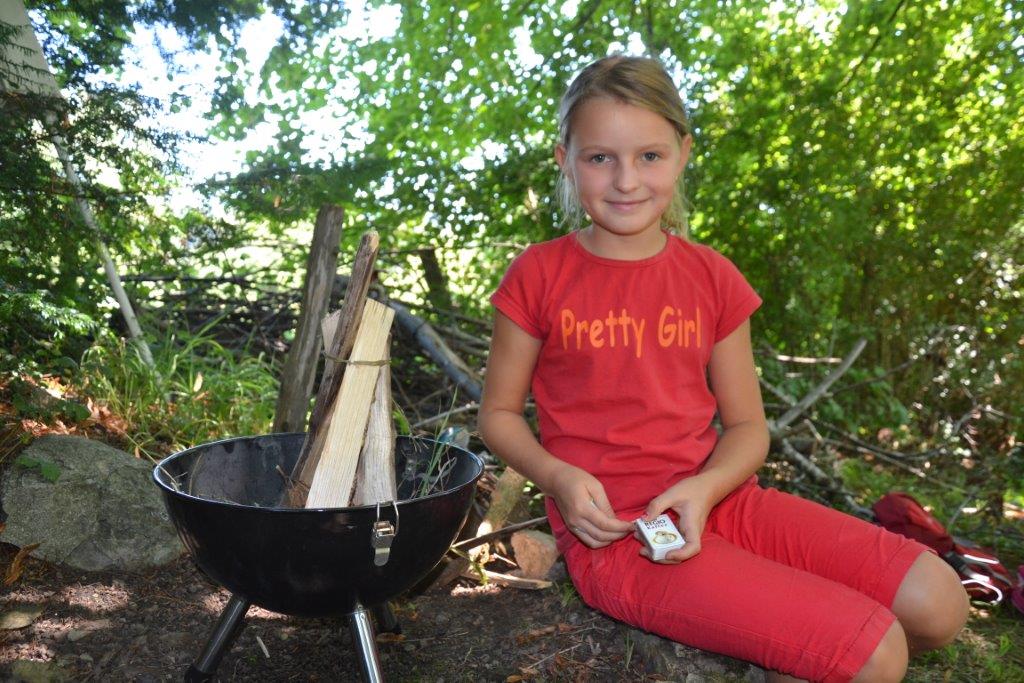 Immerhin hatten sie nur 5 Streichhölzer zur Verfügung, kein Papier oder Pappe, sondern nur Material, das sie selbst in der Natur fanden. Nach einigen Versuchen und Irrtümern schafften es alle, in ihrer Feuerschale ein Feuer zu entzünden. Nicht nur Holz und Zunder, sondern vor allem viel Erfahrung wurde dabei gesammelt. Luca, ein erfahrender Waldläufer, entzündete sein Feuer mit einem Magnesitstab in einer Erdmulde. Mit viel Ausdauer, Konzentration und der Unterstützung von Emil schafften die Jungs auch dieses Feuer zu entfachen. Gekocht wurde natürlich auch mit Hilfe des Feuers und der Gemüseeintopf schmeckte wirklich lecker! Ein Zunderbeutel aus Leder wurde hergestellt und mit selbstgesammeltem Zunder befüllt. Zum Abschluss demonstrierte unser Feuerexperte Christian Prager die Methode mit dem Handdrill. Die Kinder staunten nicht schlecht, wie einfach dies aussah und waren Feuer & Flamme für dieses Element.