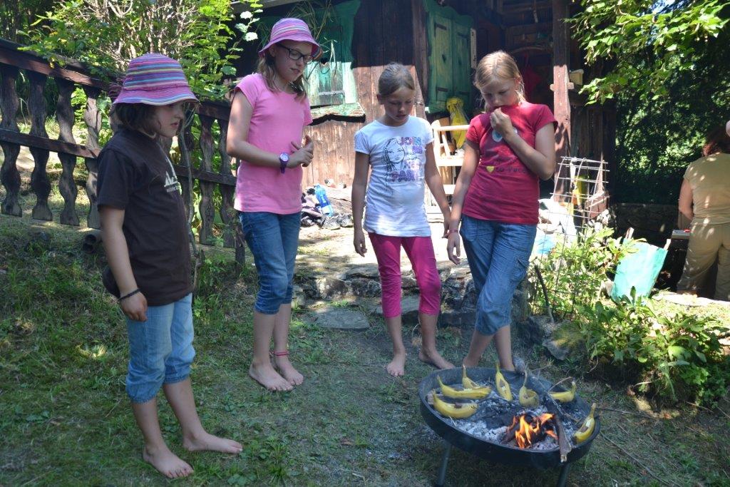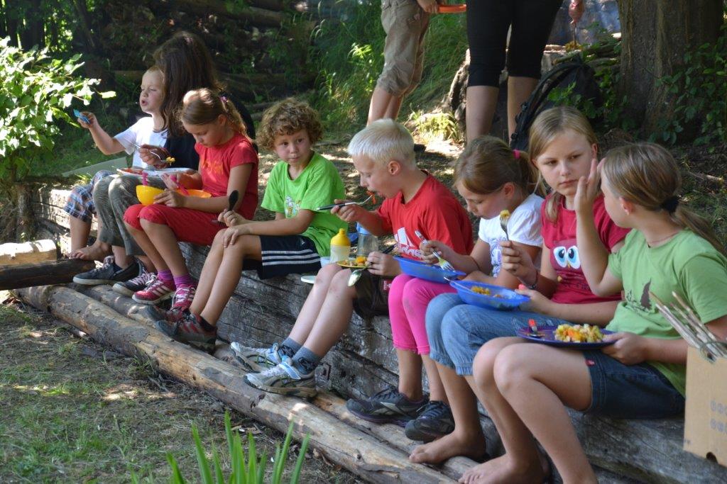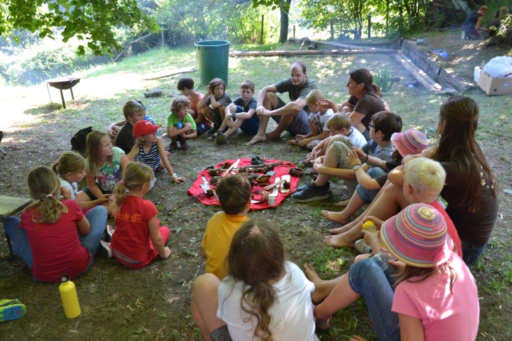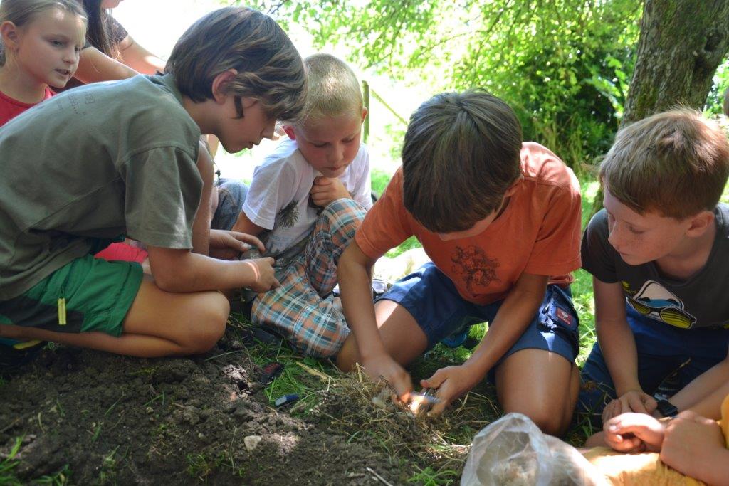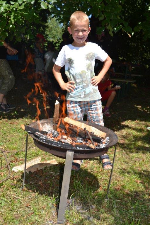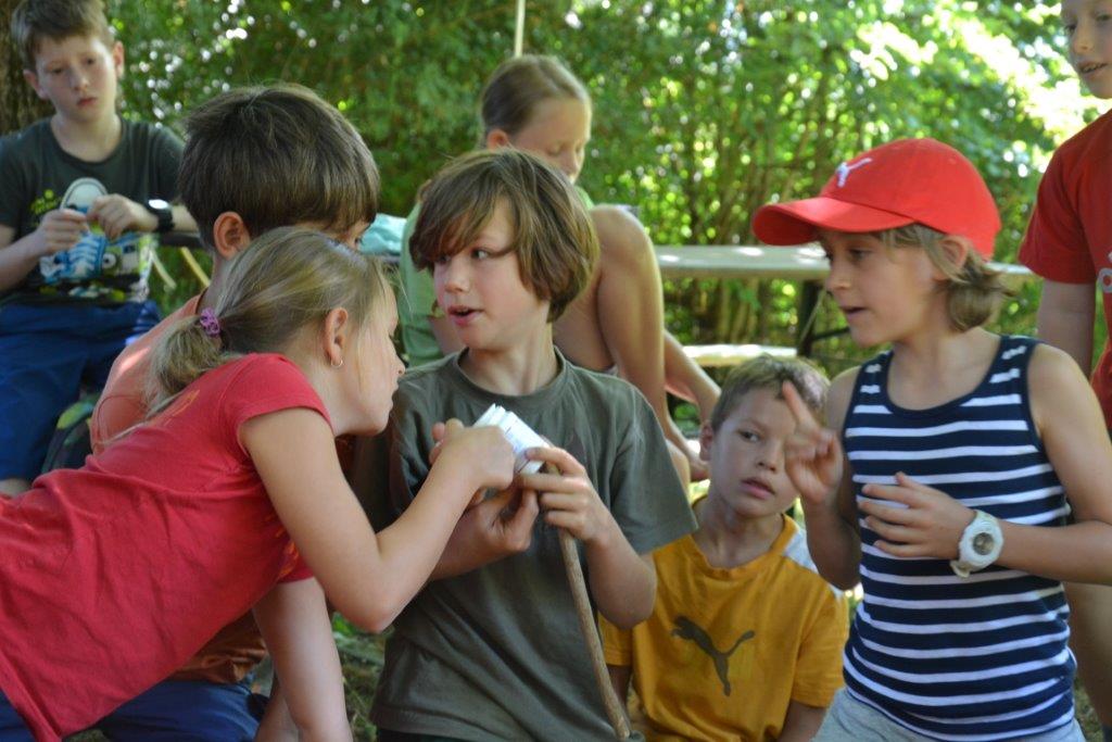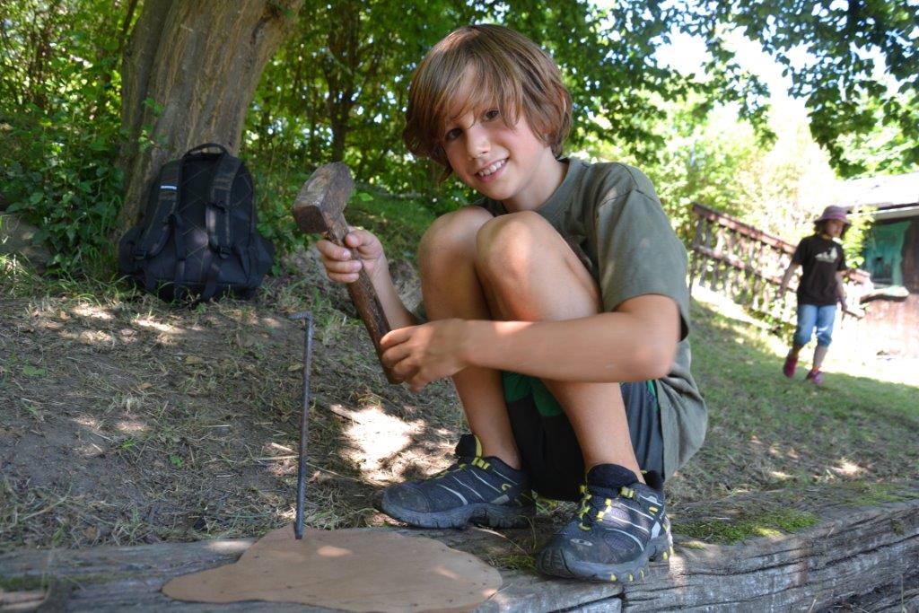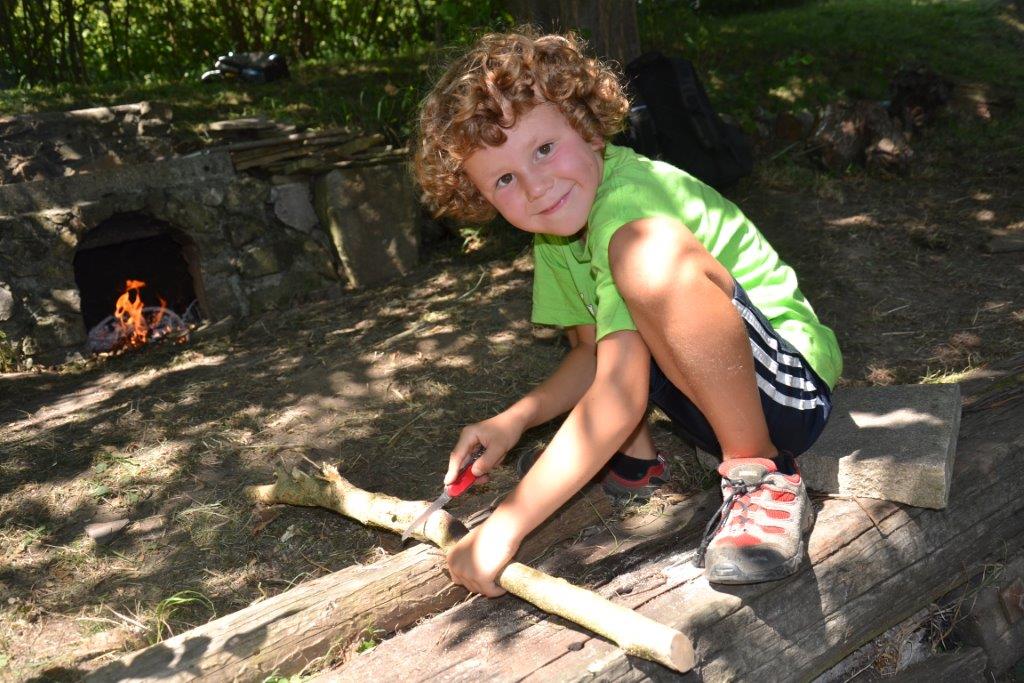Immerhin hatten sie nur 5 Streichhölzer zur Verfügung, kein Papier oder Pappe, sondern nur Material, das sie selbst in der Natur fanden. Nach einigen Versuchen und Irrtümern schafften es alle, in ihrer Feuerschale ein Feuer zu entzünden. Nicht nur Holz und Zunder, sondern vor allem viel Erfahrung wurde dabei gesammelt. Luca, ein erfahrender Waldläufer, entzündete sein Feuer mit einem Magnesitstab in einer Erdmulde. Mit viel Ausdauer, Konzentration und der Unterstützung von Emil schafften die Jungs auch dieses Feuer zu entfachen. Gekocht wurde natürlich auch mit Hilfe des Feuers und der Gemüseeintopf schmeckte wirklich lecker! Ein Zunderbeutel aus Leder wurde hergestellt und mit selbstgesammeltem Zunder befüllt. Zum Abschluss demonstrierte unser Feuerexperte Christian Prager die Methode mit dem Handdrill. Die Kinder staunten nicht schlecht, wie einfach dies aussah und waren Feuer & Flamme für dieses Element.