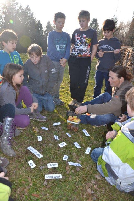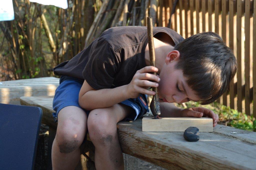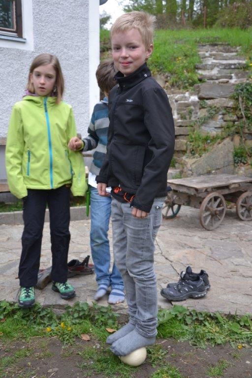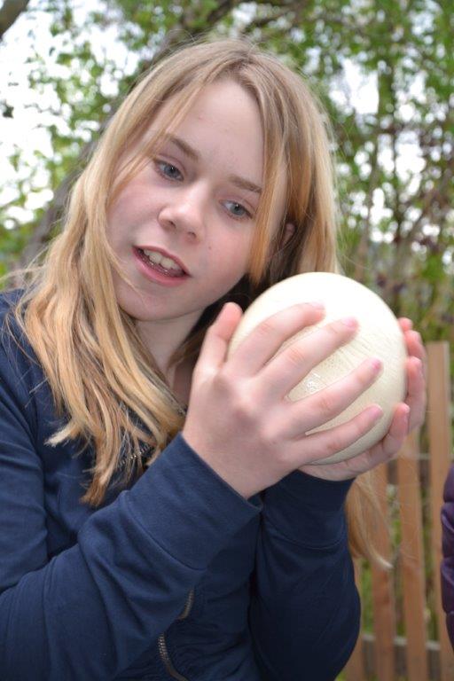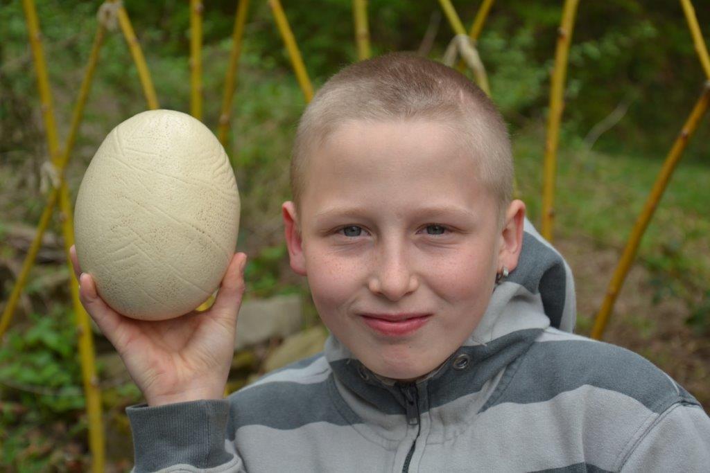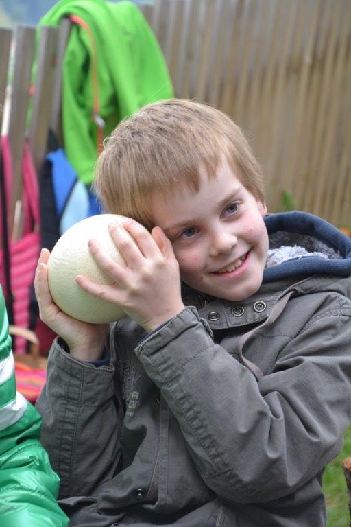 Zu unserer letzten Frühlingszusammenkunft gab es für die Dachse eine besondere Überraschung: in einem Samtsack war ein Straußenei versteckt. Was da wohl drin sein mag? Nachdem das Geheimnis gelüftet war, machten wir eine Belastungsprobe und einige mutige Kinder stellen sich AUF das Ei. Nachdem es heil blieb, haben wir entschlossen, das Ei zu öffnen. Dazu brauchten wir einen Akkubohrer und behutsame Kinder. Was wohl in dem Ei stecken mag? Vielleicht ein Küken, oder nur Dotter und Eiklar? Und wie wird das aussehen? Letztendlich war der Eiinhalt sehr ergiebig und wir bereiteten eine Eierspeise zu – die übrigens besonders lecker war! Das dazu erforderliche Feuer wurde von den Waldläufern selbst entfacht.