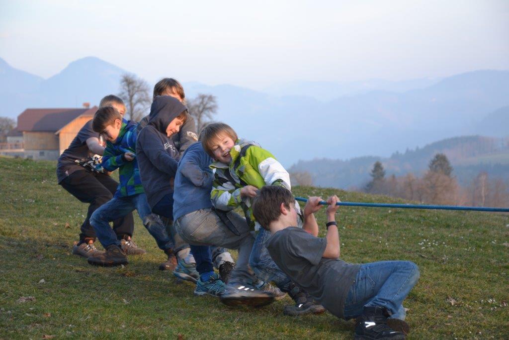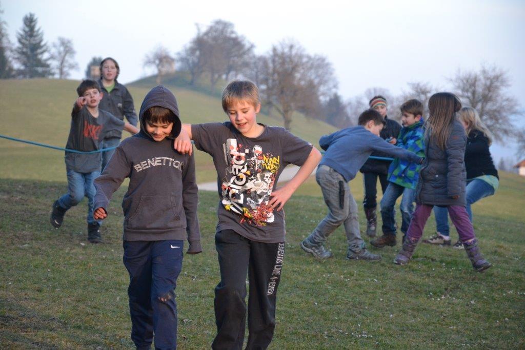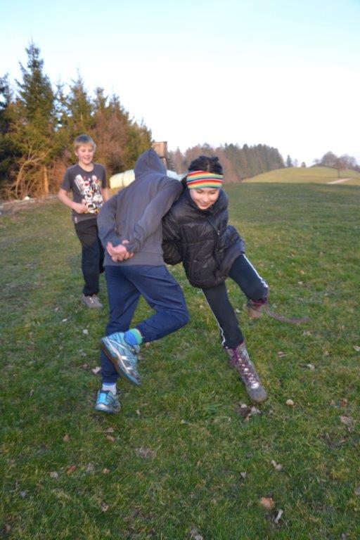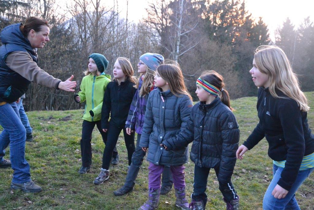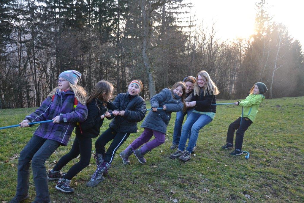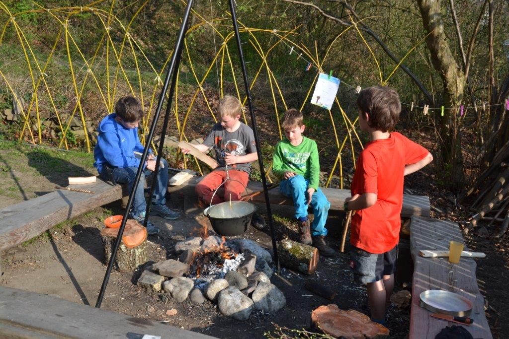 Außerdem haben die Waldläufer ihre Kräfte gemessen, sei es beim Seilziehen, beim Hahnenkampf oder in einem Wettlauf. Sie haben Tiere pantomimisch dargestellt und Spuren des Dachses gefunden, der am Eckholz seinen geheimen Bau hat. Zur Stärkung gab es regelmäßig selbstgemachten Kräutertopfen, den Judith gegen die Währung “Sauerklee oder Eichenblatt“ eintauschte. Bewegungsspiele gehörten natürlich auch dazu, der Klassiker „Räuber und Gendarm“ war ein regelmäßiger Wunsch unserer Waldläufer. Gruppendynamisch sehr spannend war zu beobachten, wie sich die Rollen in der Gruppe ergaben – immerhin wollten alle spielen, keiner jedoch Polizist sein J.