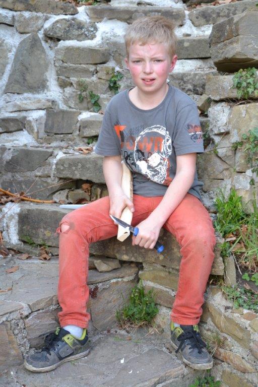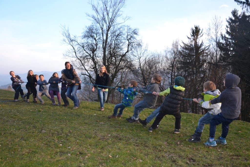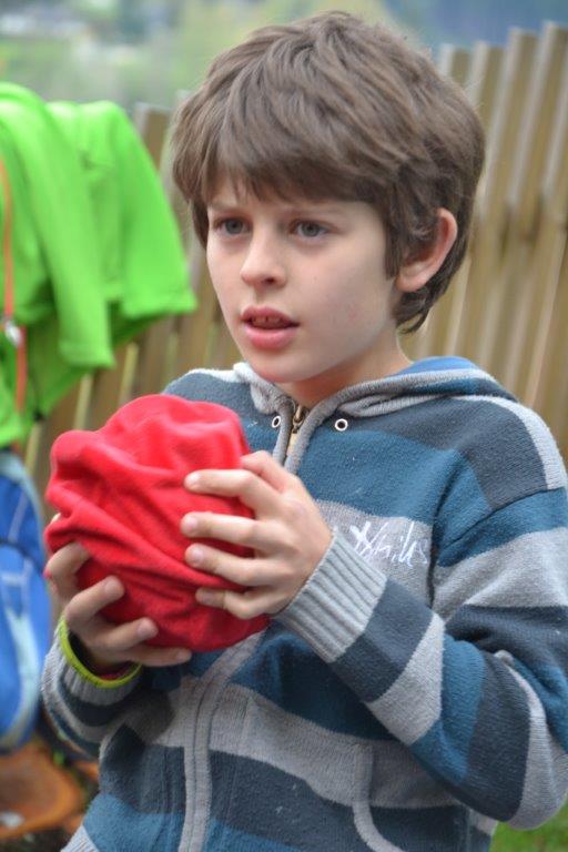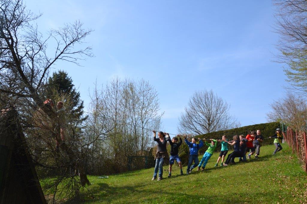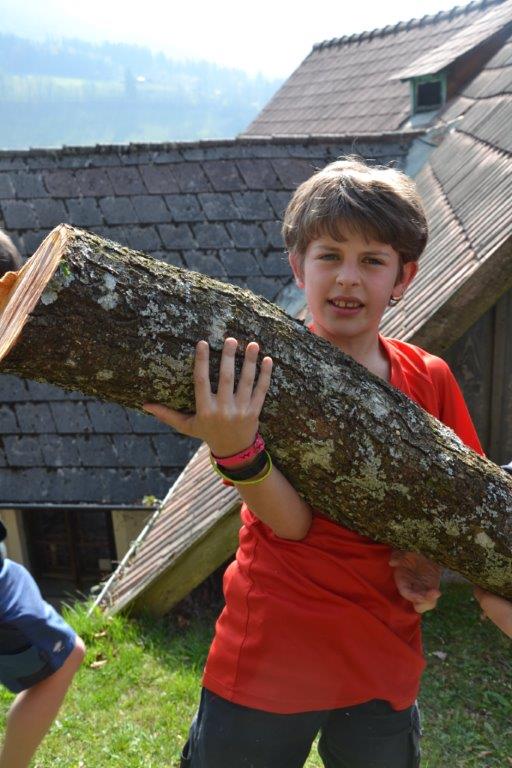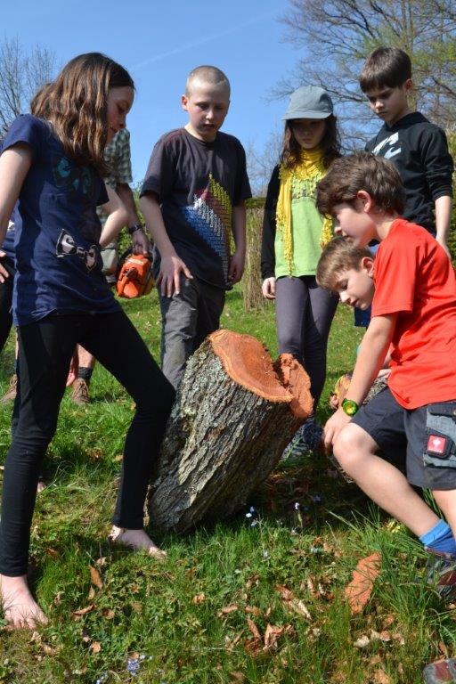 Ein besonderes Highlight war das gemeinsame Fällen des Zwetschgenbaumes, den der Sturm auf unser Dach gelehnt hatte. Her Otto tauchte überraschenderweise an einem Mittwoch bei uns auf und erklärte uns die Vorgehensweise. Während Herr Otto mit der Motorsäge auf dem Baum stand, zogen alle Waldläufer auf sein Zeichen mit vereinten Kräften an einem Seil, an dem der abzusägende Ast befestigt war. Somit konnten wir verhindern, dass das Haus beschädigt wurde. Sehr erstaunt waren wir über das rötliche Holz des Baumes, Herr Otto sägte uns einige Hocker aus dem Stamm. Diese Aktion war schon ein besonderer Moment! Wann hat man schon einmal unter fachkundiger Anleitung die gemeinsam die Möglichkeit, einen Baum zu fällen?