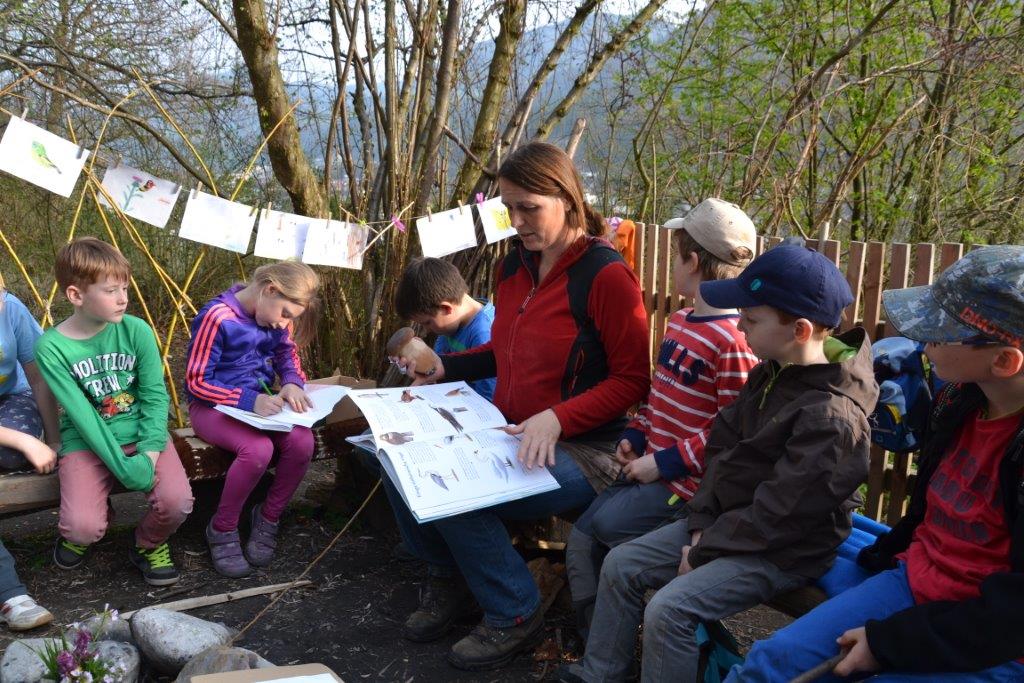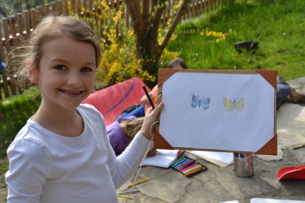 Die Füchse waren auch sehr kreativ: es gibt einige Zeichenkünstler unter ihnen, die sehr detailgetreu Tiere und Pflanzen wiedergaben, andere schnitzten, bauten Pfeil und Bogen oder bastelten Osternester aus Moos und Lianen. Die Geschenke des Frühlings luden uns auch zum Kochen und Blumenpflücken ein. Natürlich kamen auch gemeinsame Bewegungsspiele nicht zu kurz. Am liebsten springen die „Füchse“ am langen, blauen Seil!