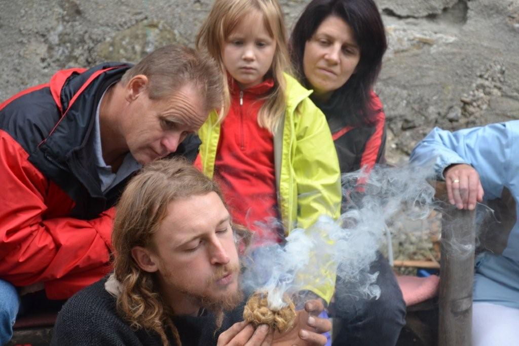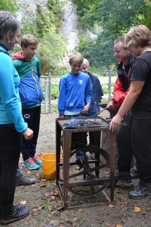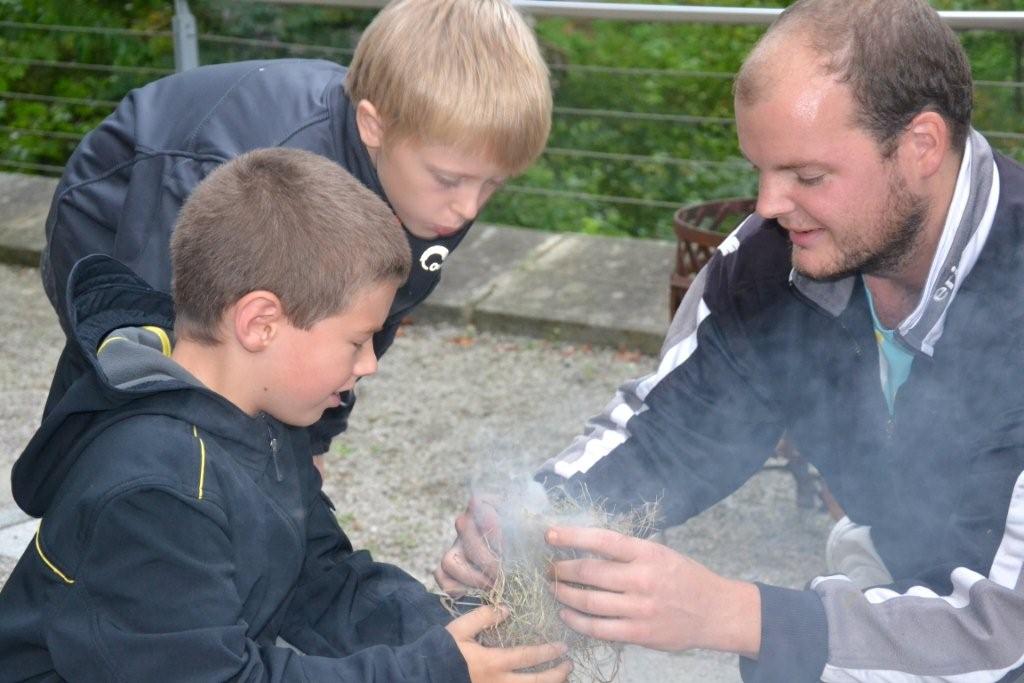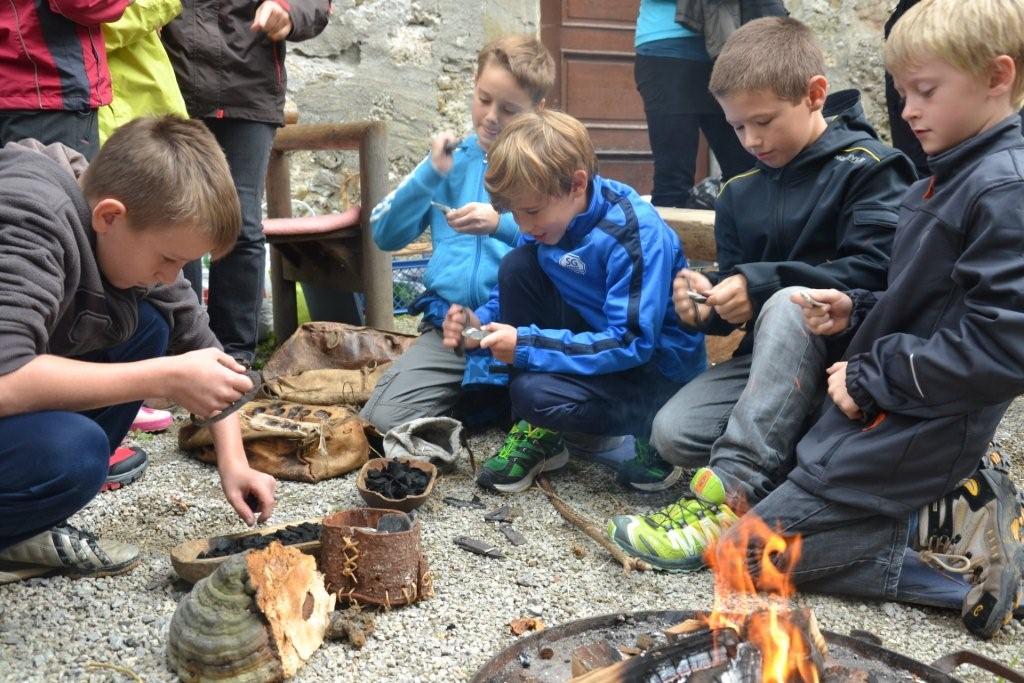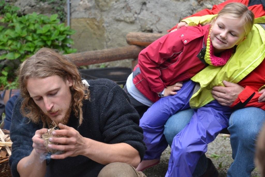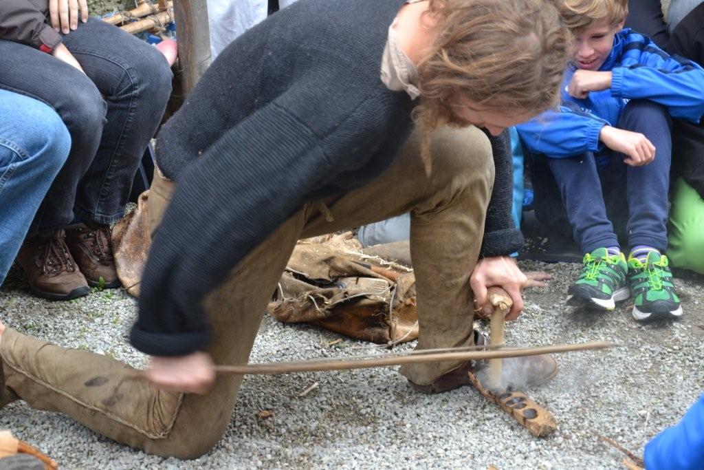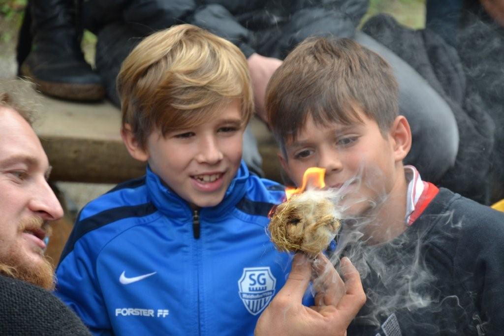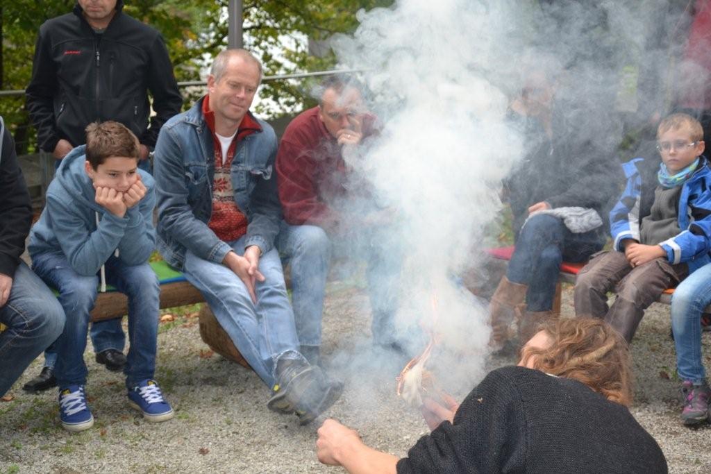 Der Natur- und Wildnisexperte Gernot Mühlberger entfachte auf ursprüngliche Art und Weise mit dem Feuerbohrer ein Feuer und zeigte den Teilnehmern, wie man mit dem Feuerstein und dem Feuereisen Funken erzeugen und Feuer gewinnen kann. Christian Prager vom spür.sinn-Team demonstrierte die Methode des Handdrills. Des weiteren bestand die Möglichkeit mit Herrn Gernot Walter ein eigenes Feuereisen in der „Schwarzen Kuchl“ zu schmieden. Es wurde gehämmert, geschlagen, gefunkt und gerieben und so mancher Teilnehmer zeigte sich unermüdlich im Versuch ein eigenes Feuer zu entfachen. Abschließend wurden Fische am Lagerfeuer gegrillt und der Abend klang nach einem ereignisreichen Nachmittag in gemütlicher Runde aus.