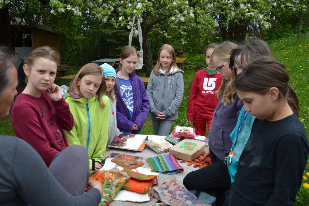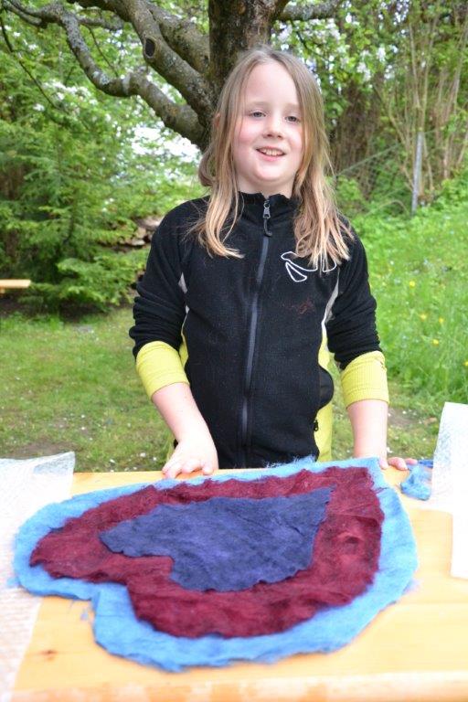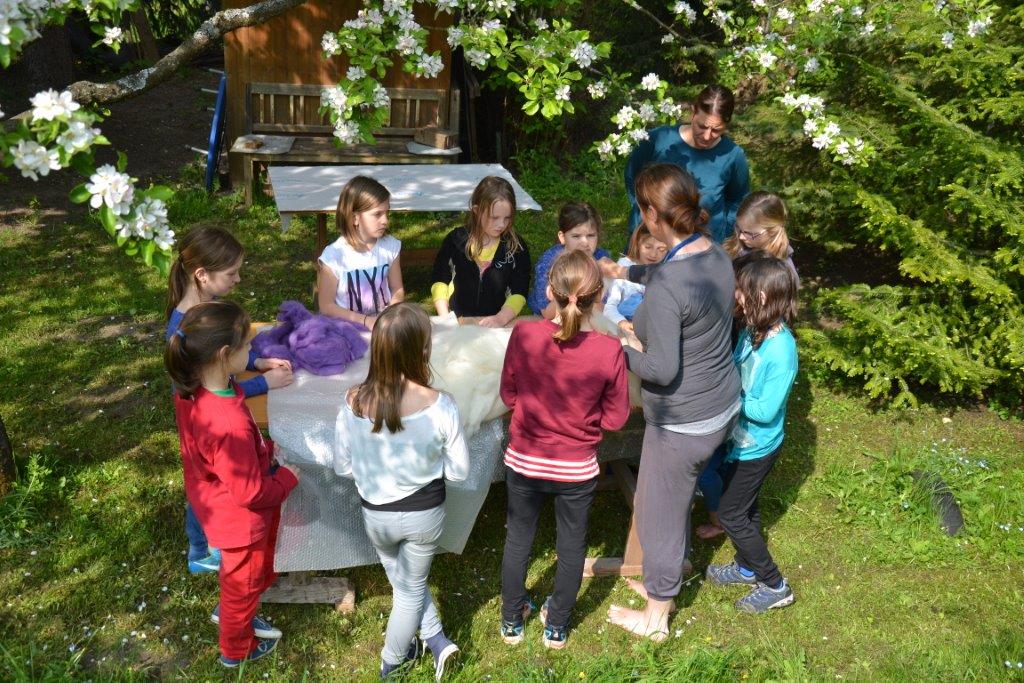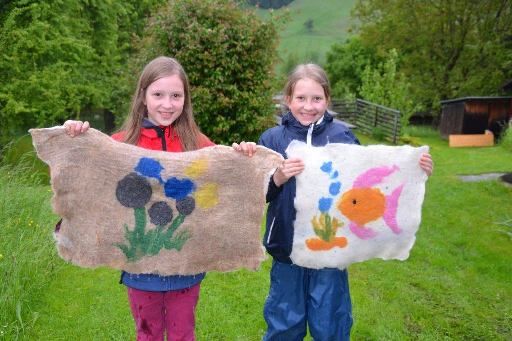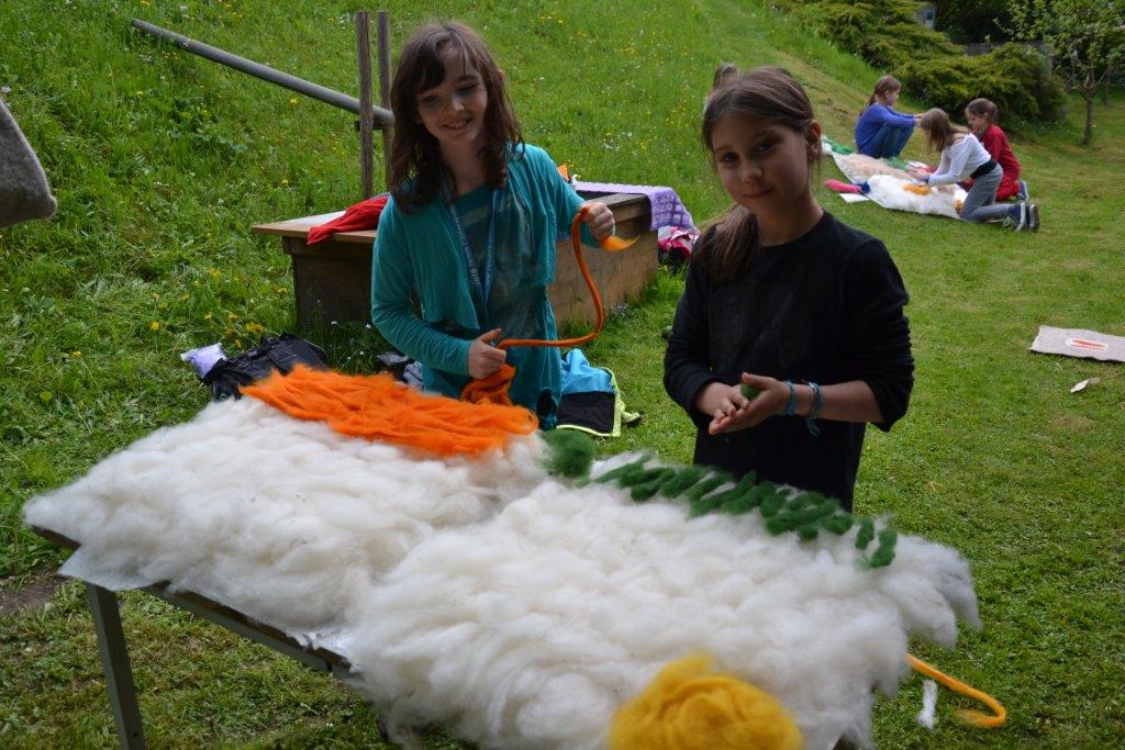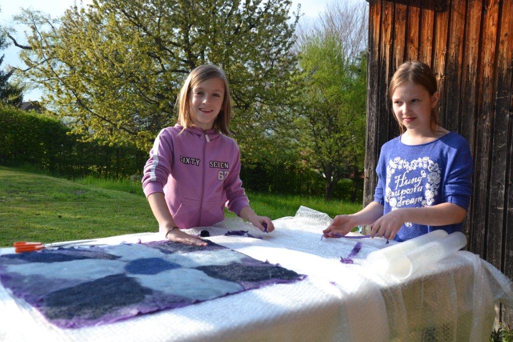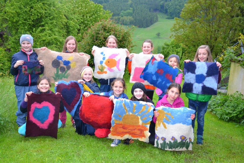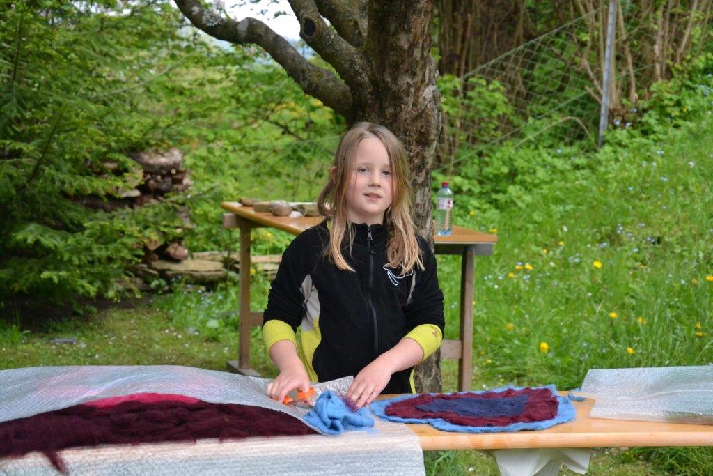 Bei diesem Handwerkskreis trafen sich kreative Kinder an zwei Nachmittagen, um die alte Kunst der Wollverarbeitung kennenzulernen. Beim ersten Treffen hatten wir wunderbares Frühlingswetter und konnten uns unter dem blühenden Apfelbaum inspirieren lassen um dann in den kreativen Prozess zu gelangen. Einige Mädchen wussten sofort, welches Motiv sie für ihr Sitzkissen möchten. Bei Saft und Gugelhupf haben wir uns dann auch gestärkt und es war erstaunlich, wie weit die Kinder mit ihren Werkstücken kamen. Beim zweiten Treffen machten die Eismänner ihrem Namen alle Ehre und wir mussten unsere Freiluftwerkstätte in die Hütte im Garten und die Garage verlegen. Es wurde gefilzt und gewalkt, mit Wasser getränkt und gerollt! Statt Saft gab es wärmenden Tee und die fertigen Kunstwerke sind so bunt wie die Kinder selbst! Stolz gingen die Mädchen mit ihren Sitzkissen nach Hause – jedes für sich ein Unikat!