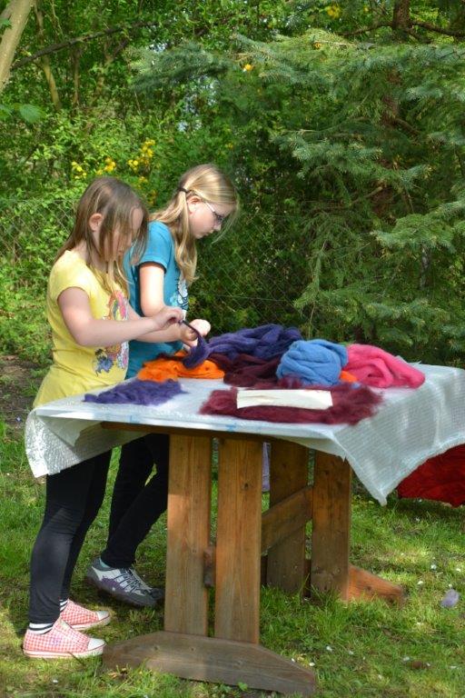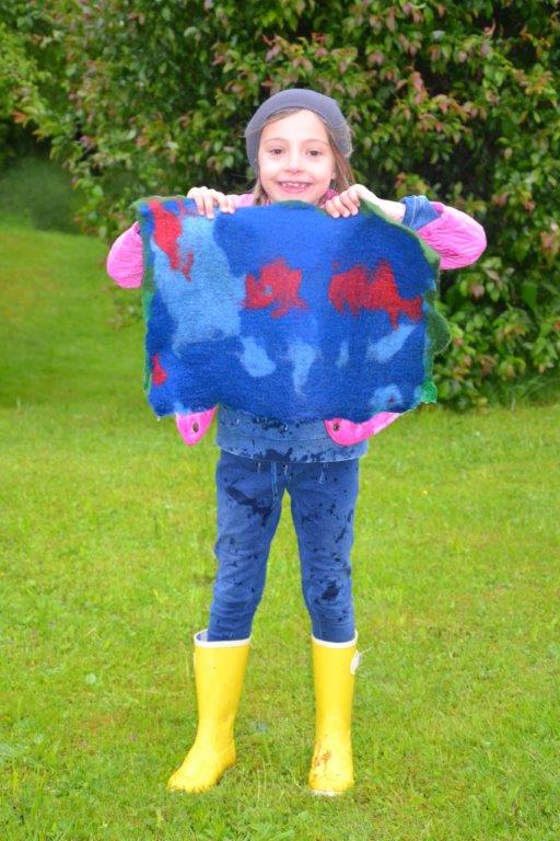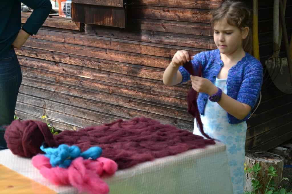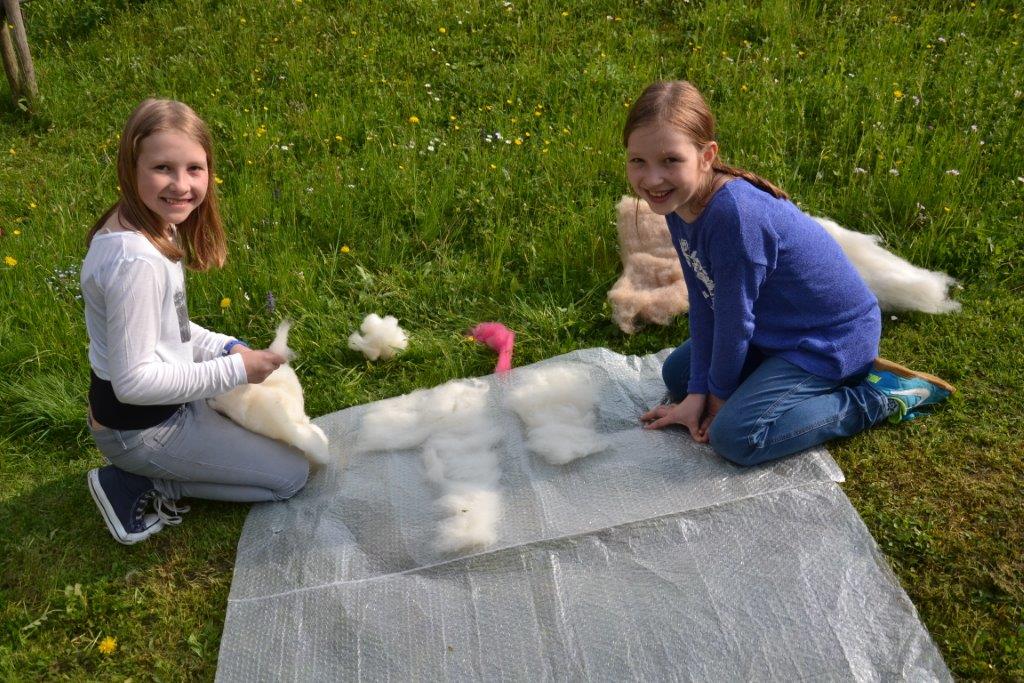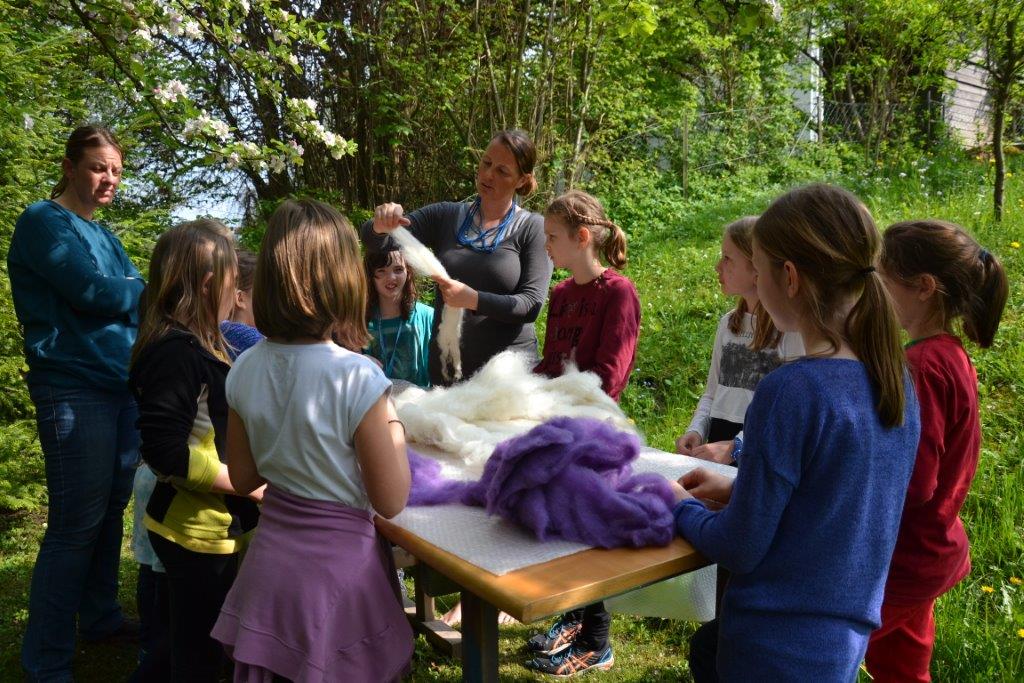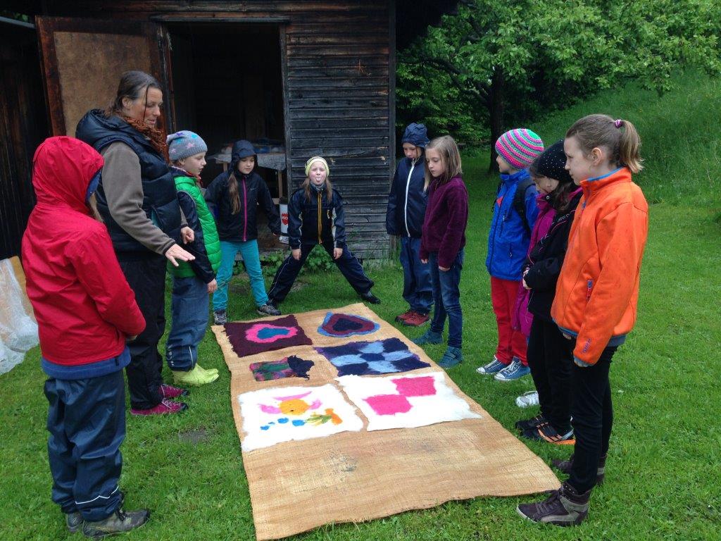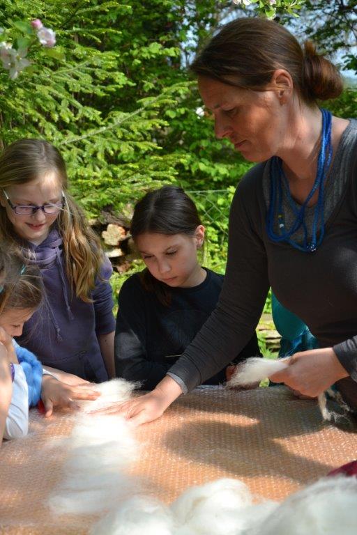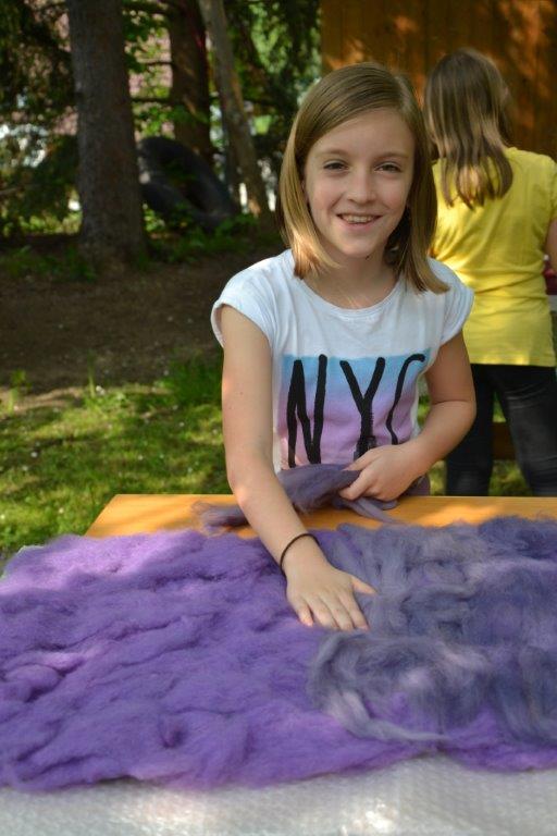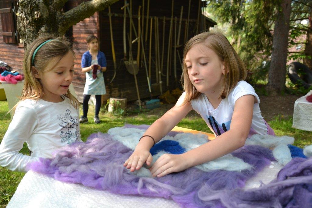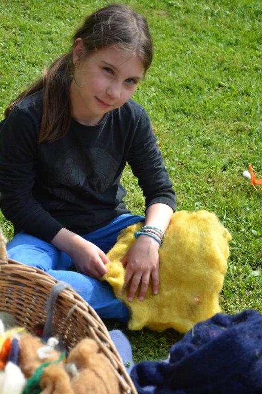 Bei diesem Handwerkskreis trafen sich kreative Kinder an zwei Nachmittagen, um die alte Kunst der Wollverarbeitung kennenzulernen. Beim ersten Treffen hatten wir wunderbares Frühlingswetter und konnten uns unter dem blühenden Apfelbaum inspirieren lassen um dann in den kreativen Prozess zu gelangen. Einige Mädchen wussten sofort, welches Motiv sie für ihr Sitzkissen möchten. Bei Saft und Gugelhupf haben wir uns dann auch gestärkt und es war erstaunlich, wie weit die Kinder mit ihren Werkstücken kamen. Beim zweiten Treffen machten die Eismänner ihrem Namen alle Ehre und wir mussten unsere Freiluftwerkstätte in die Hütte im Garten und die Garage verlegen. Es wurde gefilzt und gewalkt, mit Wasser getränkt und gerollt! Statt Saft gab es wärmenden Tee und die fertigen Kunstwerke sind so bunt wie die Kinder selbst! Stolz gingen die Mädchen mit ihren Sitzkissen nach Hause – jedes für sich ein Unikat!