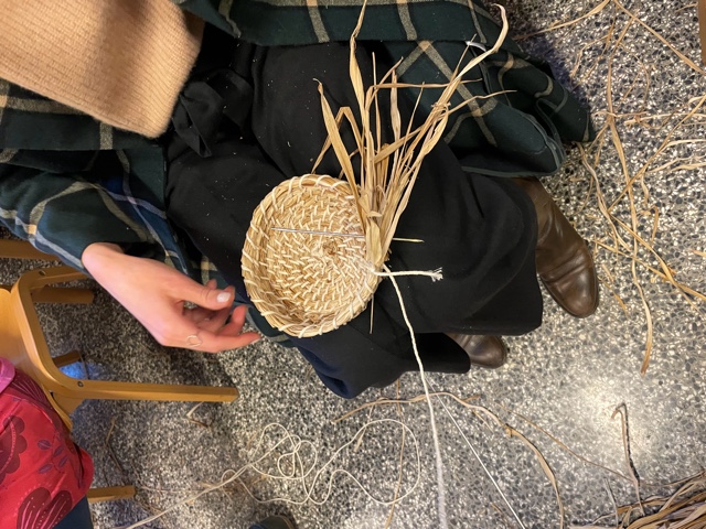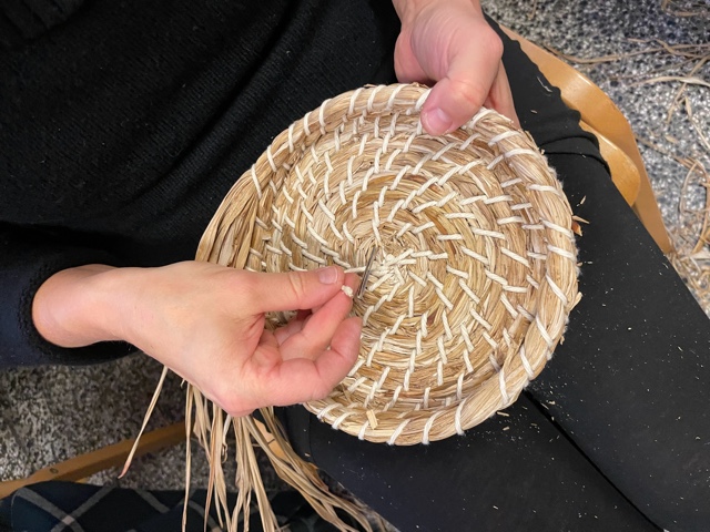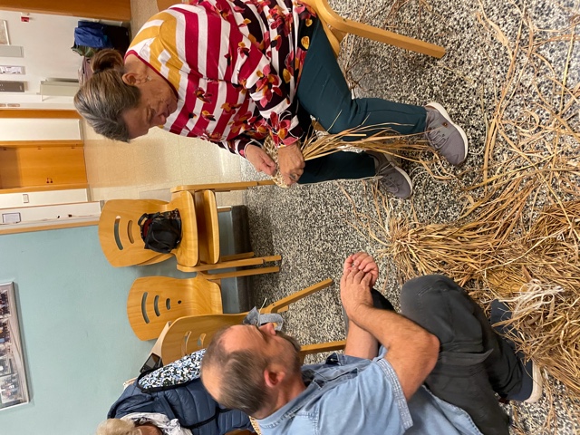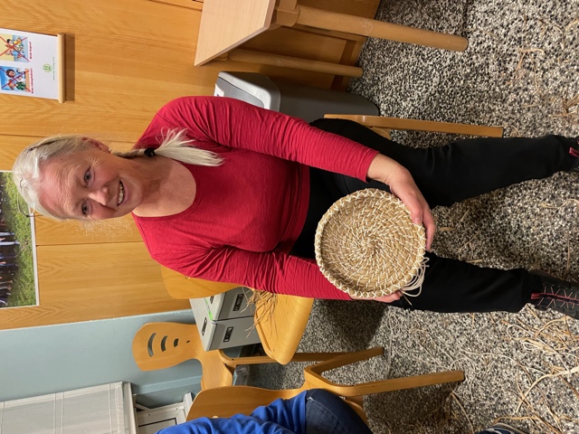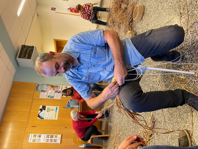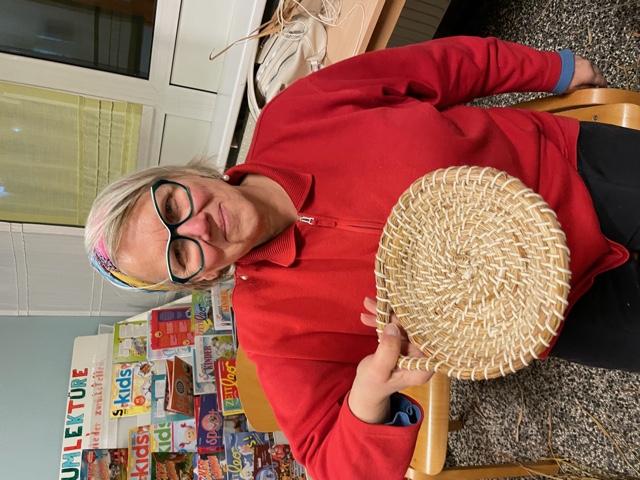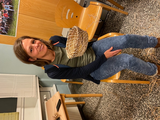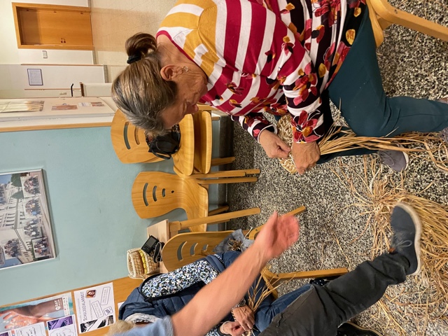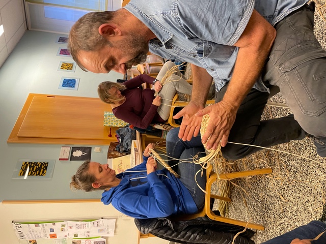 Gearbeitet wurde mit getrockenen Gräsern der Taglilie. Das Verarbeiten von Kräutern, wie zum Beispiel Lavendel, setzt ein wenig mehr Erfahrung und Übung voraus.Gut geeignet sei auch die Binse, die in unserer Gegend üppig wächst und die auch zu jeder Jahreszeit verarbeitet werden kann.