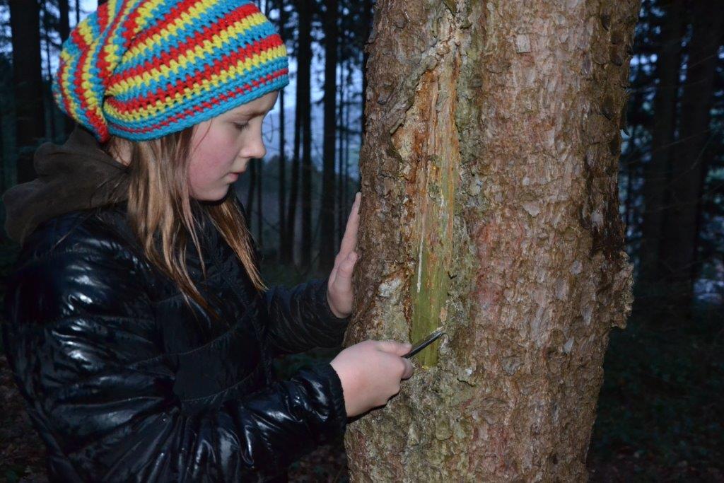Besonders interessant war der gefundene Eichhörnchenkobel, den der Sturm vom Baum gefegt hatte. Ob ein Eichhörnchen mehrere Kobel besitzt, haben wir uns gefragt? Hoffentlich! Auch einen Feuersalamander haben wir beim Harzernten entdeckt. Sollte der nicht schon in Winterstarre sein? Warum war der so dick? Trägt der etwa schon die Eier für den Frühling in sich? Fragen über Fragen... Bald wurde es finster - so machten wir uns auf in die "Hexenküche" und bereiteten eine Harzsalbe zu. Zudem wurden die Bärlauchzwiebel geputzt und anschließend auf dem Butterbrot verputzt :) Die Ringelblumenseifen vom letzten Mal wurden noch zugeschnitten und zu Geschenken verpackt. Bis Weihnachten müssen sie noch reifen - ein passenendes Geschenk der Hexen unterm Christbaum!