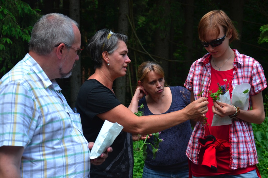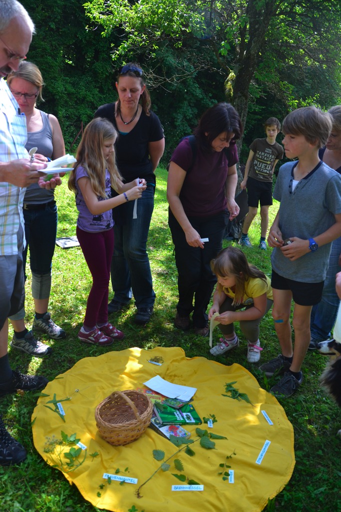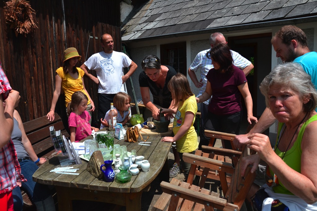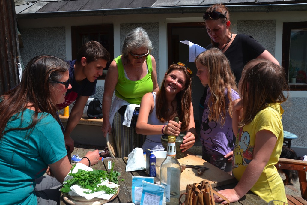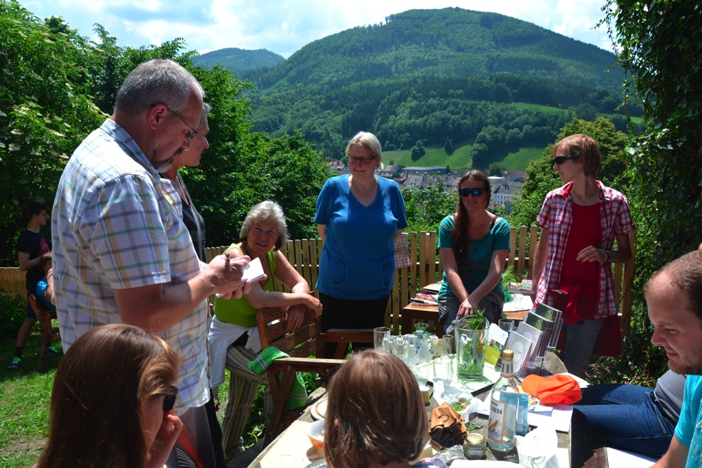 Manuela Hüttenbrenner führte durch den Vormittag und stellte auf achtsame und informative Weise unsere heimischen Kräuter vor. Bei einer Rundwanderung vermittelte sie sowohl Erwachsenen als auch Kindern Wissenswertes über unsere Pflanzenfreude, deren Heilwirkung, Zubereitungsmöglichkeit und Besonderheit. Die gesammelten Pflanzen wurde anschließend gemeinsam verarbeitet: so wurde eine Verreibung hergestellt und ein Fichtenwipferlsaft angesetzt. Beim Verkosten des köstlichen Kräutertopfens klang die Veranstaltung bei herrlichem Wetter gesellig aus.