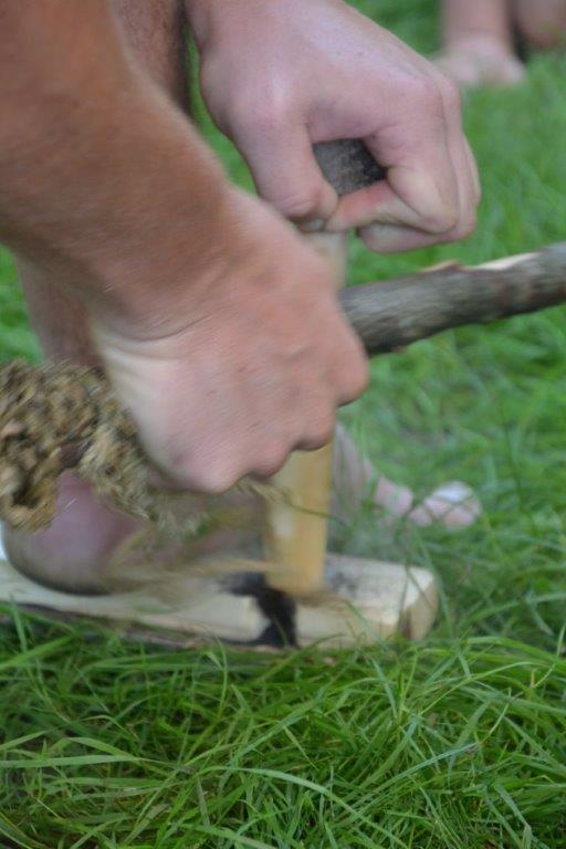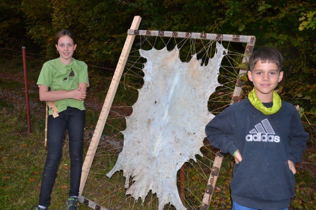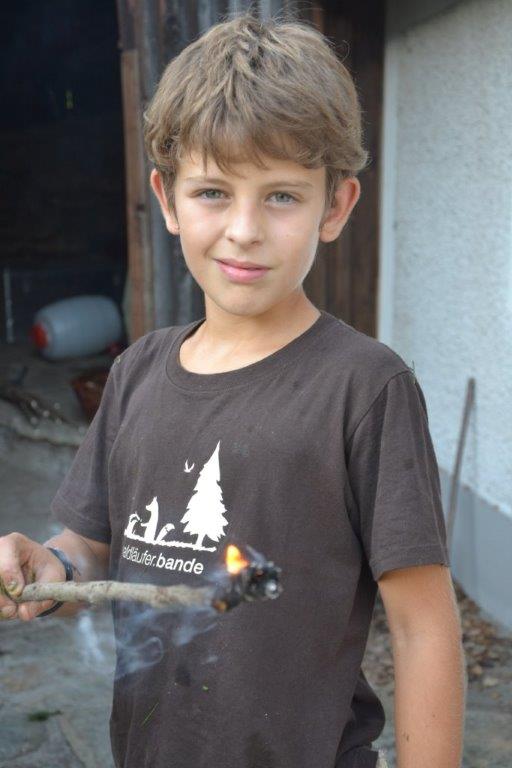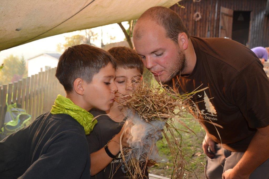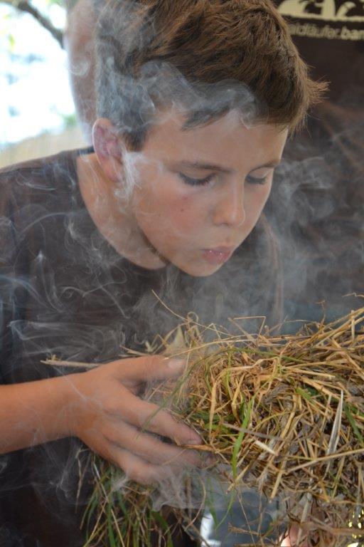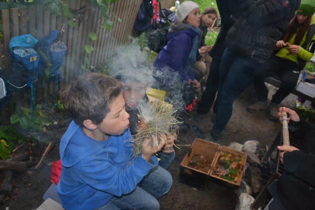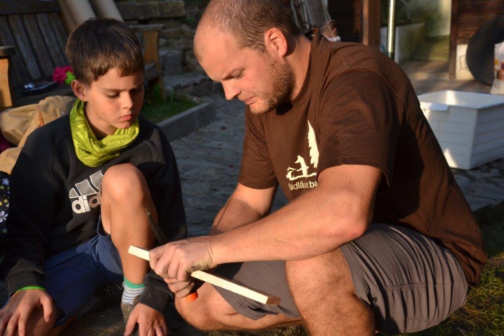 Das Streunen am Anfang ist ja schon fast eine Routine bei den Dachsen. Zudem wurde mit verschiedenen alten Techniken gearbeitet, wie das Feuermachen ohne Streichhölzer, das Gerben oder das Schnitzen eines Löffels. Einige haben auch selbst ein Feuerbogenset hergestellt und übten das Feuermachen bis der Schweiß auf der Stirn stand. Bei so manchem hätte nicht viel gefehlt und die Glut wäre geboren gewesen. Das Zubehör fürs Feuer haben die Kinder zum Teil aus dem Wald geholt und Vorräte von Zunder und Harz angelegt.