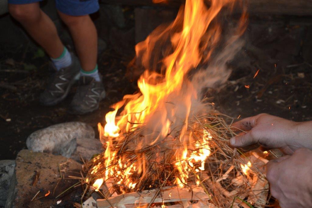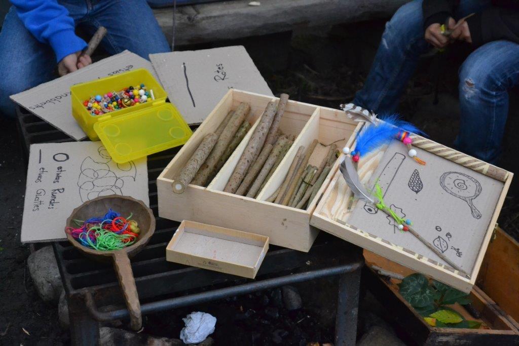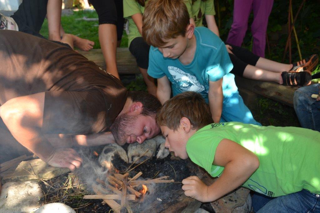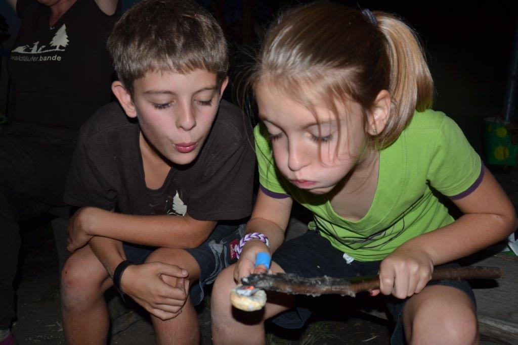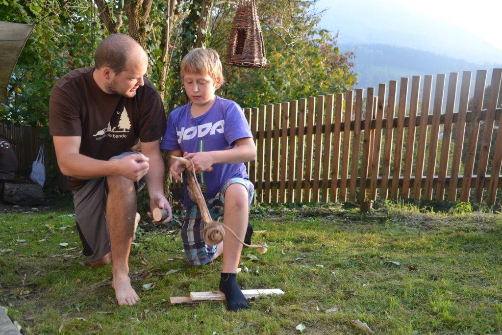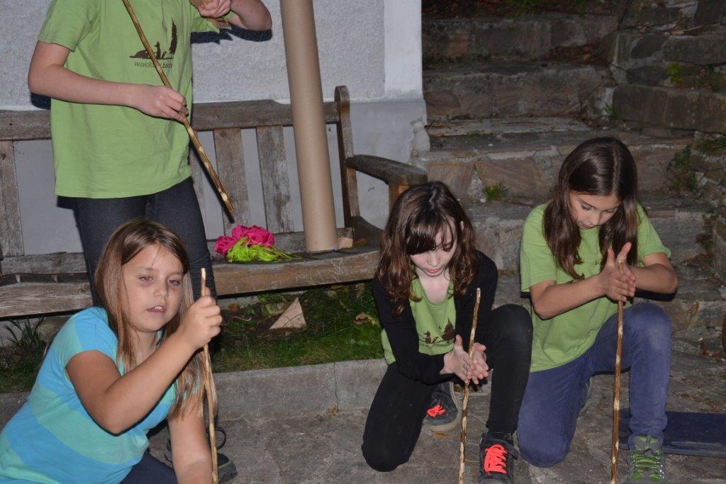 Das Streunen am Anfang ist ja schon fast eine Routine bei den Dachsen. Zudem wurde mit verschiedenen alten Techniken gearbeitet, wie das Feuermachen ohne Streichhölzer, das Gerben oder das Schnitzen eines Löffels. Einige haben auch selbst ein Feuerbogenset hergestellt und übten das Feuermachen bis der Schweiß auf der Stirn stand. Bei so manchem hätte nicht viel gefehlt und die Glut wäre geboren gewesen. Das Zubehör fürs Feuer haben die Kinder zum Teil aus dem Wald geholt und Vorräte von Zunder und Harz angelegt.