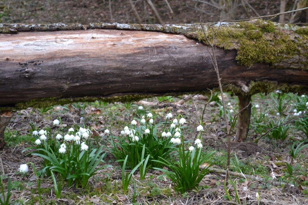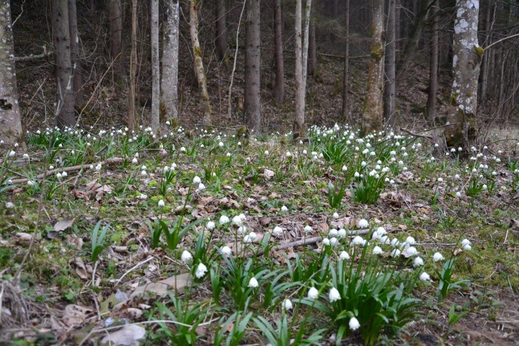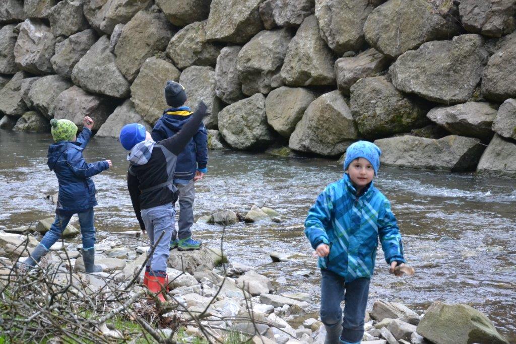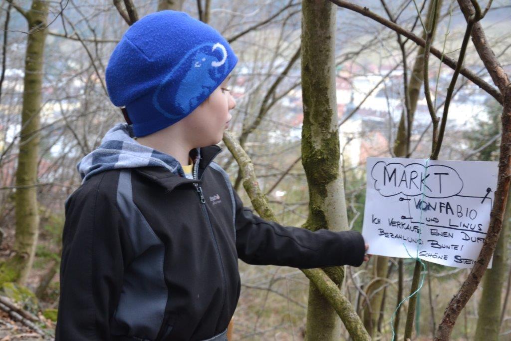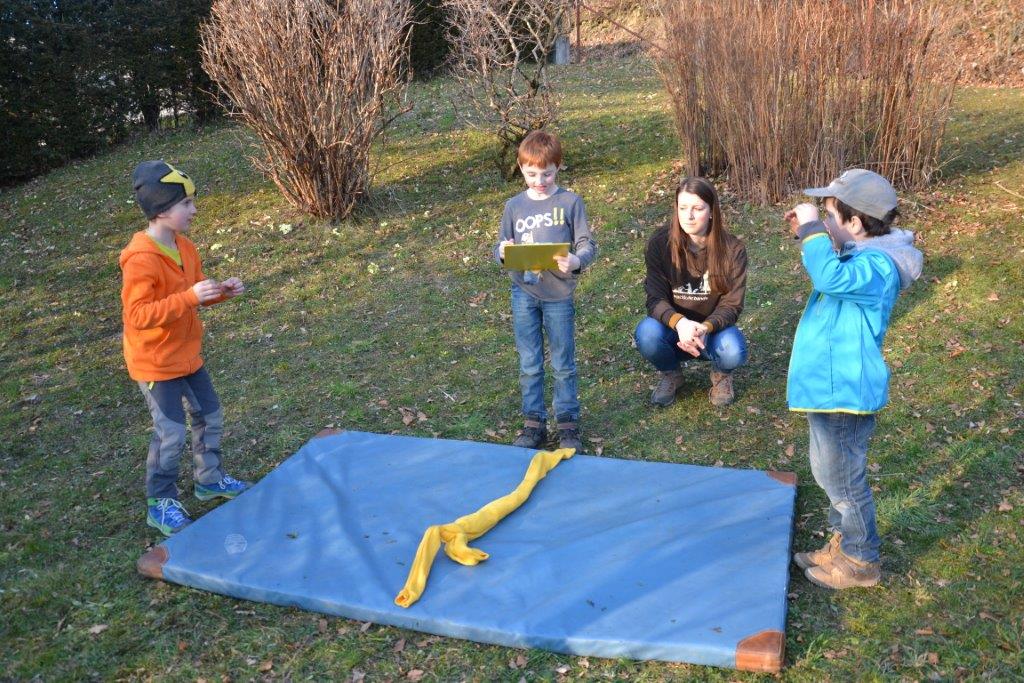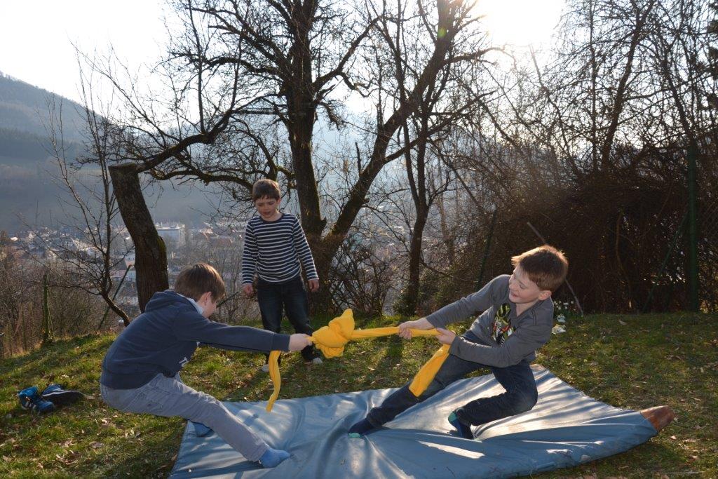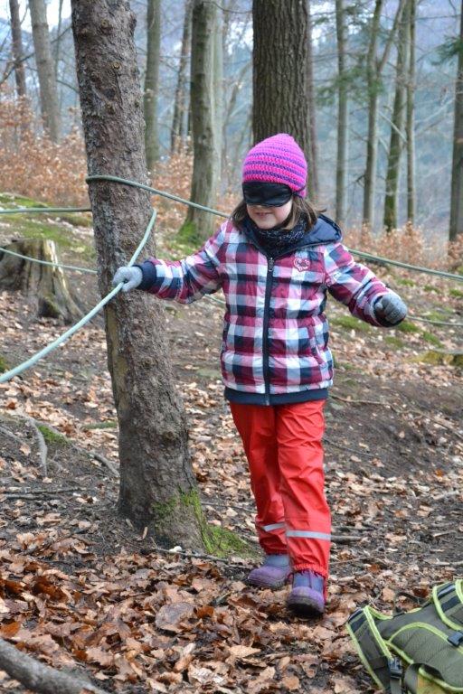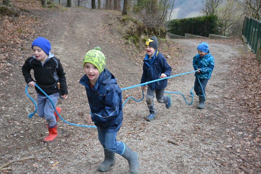 Das blaue Seil war an jedem Nachmittag mit dabei. Es wurde für Wahrnehmungsspiele, zum Seilspringen sowie zum Schaukeln und Schwingen an Bäumen verwendet. Besondere Dienst hat es uns erwiesen, als wir zum geheimen "Platz der alten Eiche" wanderten. Da dieser Platz am Ufer eines Baches unterhalb eines sehr steilen Waldabhanges liegt, nutzten wir es zum Abseilen sowie als Aufstiegshilfe zurück. Bei der alten Eiche angekommen staunten wir über den Bärlauch und die unzählbaren Frühlingsknotenblumen, die dort wuchsen! Außerdem gibt es dort wunderbare Steine zu sammlen, die - zurück am Eckholz - für die anderen Kinder bei einem Verkaufsstand gegen die Bezahlung von Frühlingsblumen erhältlich waren.