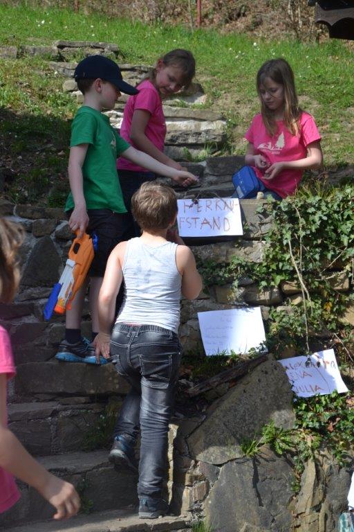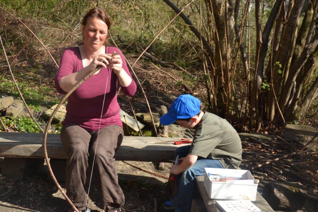 Gleich beim ersten Treffen bekamen wir unerwartet Besuch von einer jungen, koreanischen Frau. Sie stammt aus Virginia (USA) und erzählte uns, dass sie mit einigen Freunden eine Reise durch Europa macht und Ostereier verkauft, um dieses Vorhaben zu finanzieren. Wie sie den Weg zu uns aufs Eckholz gefunden hat, ist uns noch heute ein Rätsel :). Unsere Waldläufer konnten sich darin üben, die Englisch zu hören, Uli hat übersetzt und sie nannten unserem Gast ihren Namen und ihr Alter in der fremden Sprache. Letztendlich gab es eine demokratische Abstimmung, welches Osterei wir erstehen und das grüne Ei konnte das Rennen für sich entscheiden.