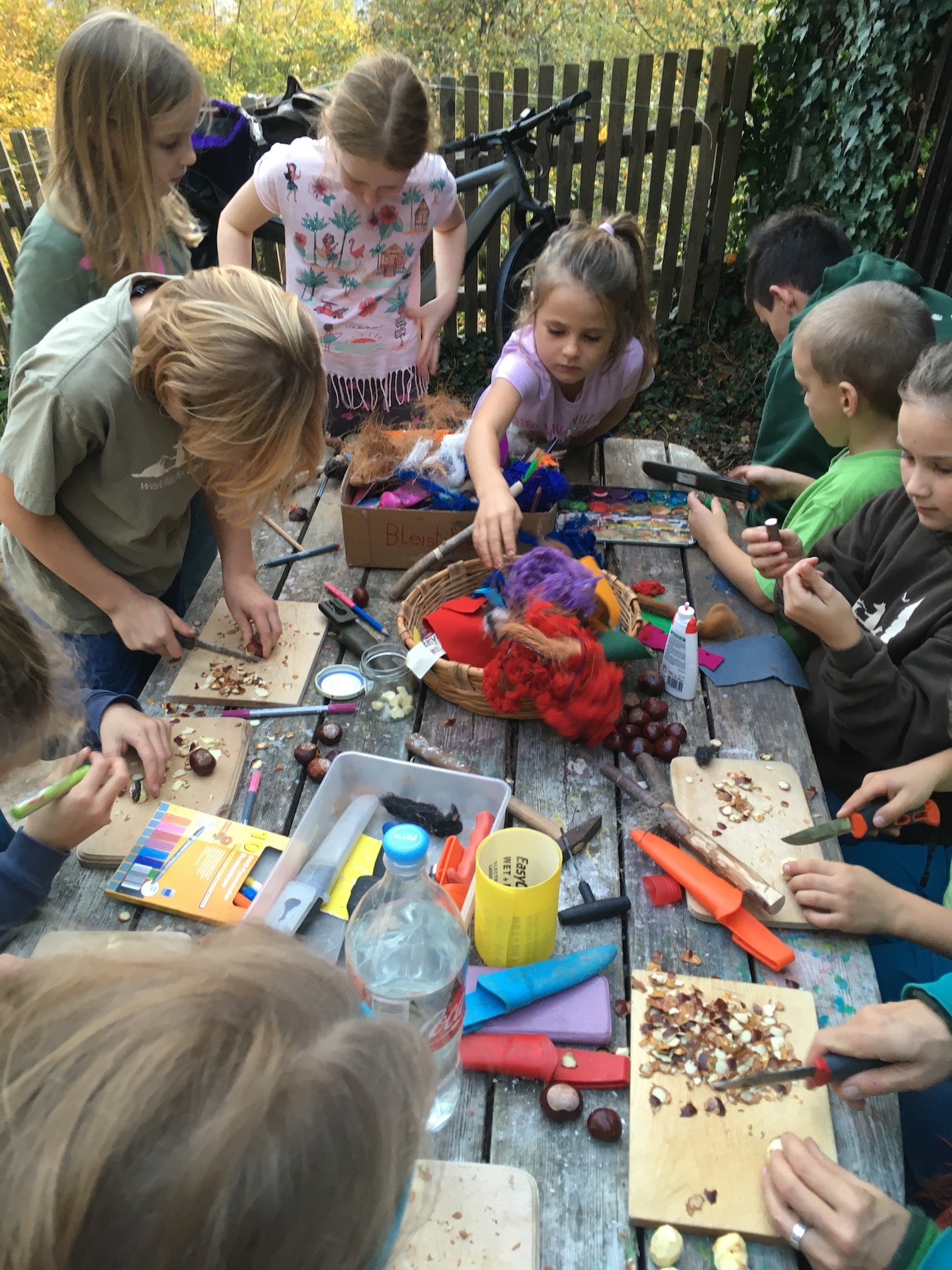 Besonders im Herbst gab es viel zu Ernten und Verarbeiten: Wir haben aus Kastanien eine Waschlauge hergestellt, bunte Herbstblätter gesammelt und sie mit Wachs überzogen und daraus Girlanden und Mobiles gebastelt. Dabei haben wir unsere Aufmerksameit auf die unterschiedlichen Blätter und Früchte der Bäume und Sträucher die uns umgeben gelenkt.
