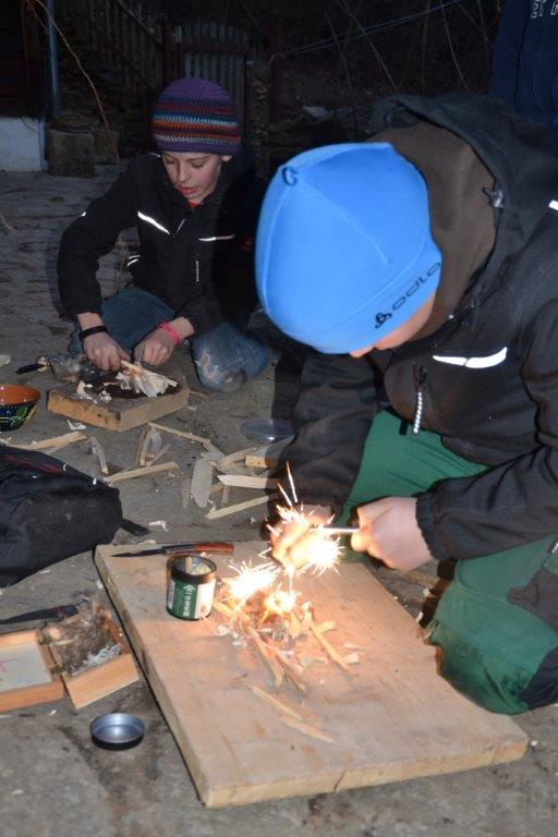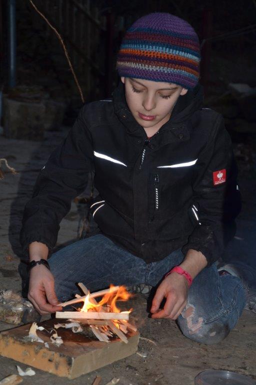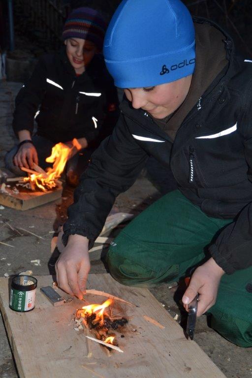 Wir starteten mit einer Schnitzeljagd quer durch den Wald, wo die Dachse schlussendlich einen kleinen Schatz fanden. Von den Jungs wurden wieder einige Feuer entzunden, sie konnten ihre Fertigkeiten weiter vertiefen und wollten auch wissen, wer der bessere Feuermacher ist. Und so wurde beim zweiten Treffen ein Feuerbattle veranstaltet. Das Ergebnis konnte sich sehen lassen! Unglaublich, wie schnell die Buben schon ein Feuer entfachen können. Xaver ging als Sieger hervor - was auch auf seine fein säuberlich gesammelten Zundermaterialien zurückzuführen sein könnte. Selbst bei Regenwetter schaffen es die Waldläuferbuben ein Tipifeuer zu entzünden! Die Vorgabe war, die Hälfte des Brennmaterials aus dem Wald zu holen. Auch die Mädchen übten ihre Feuerfertigkeiten und bekamen Unterstützung von den Experten.