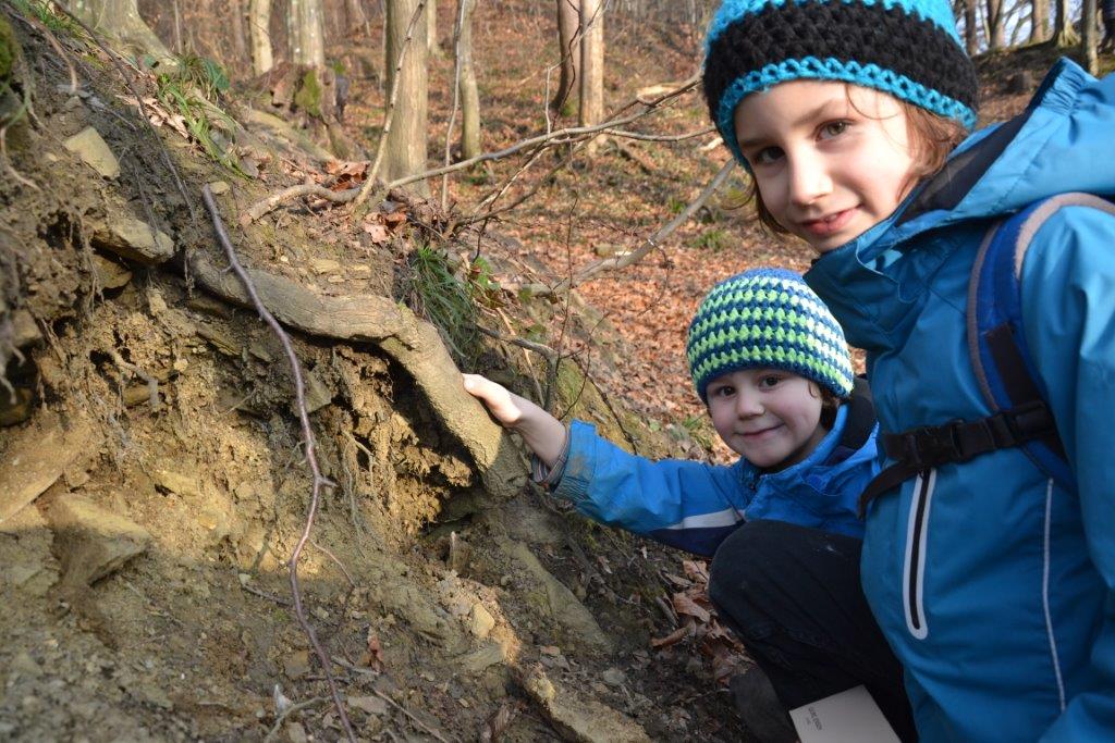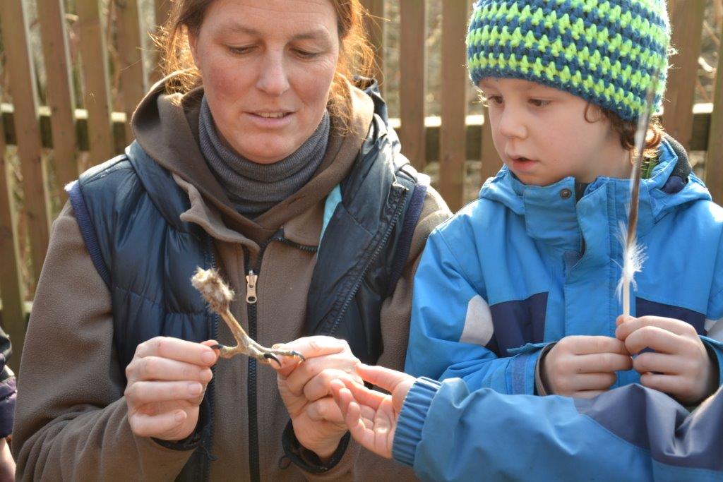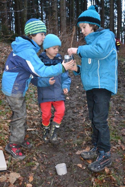 Neben einigen Fraßspuren, Mäuselöchern, Bauen, Losungen und Federn haben wir im feuchten Boden zahlreiche Rehspuren entdeckt. Wir vermuten sogar, eine Fuchsspur gefunden zu haben. Besonderer Dank gilt einem Spaziergänger, der uns mit seinem Hund auch noch einen Hundeabdruck "spendierte"! Einige Trittsiegel konnten wir durch einen Gipsabdruck festhalten und als Erinnerung mitnehmen. Dass Spurenlesen auch das Lesen einer Geschichte bedeutet, konnten die Kinder anhand von Spurenrätsel im Matsch erfahren. Da waren durchaus knifflige Aufgaben dabei!