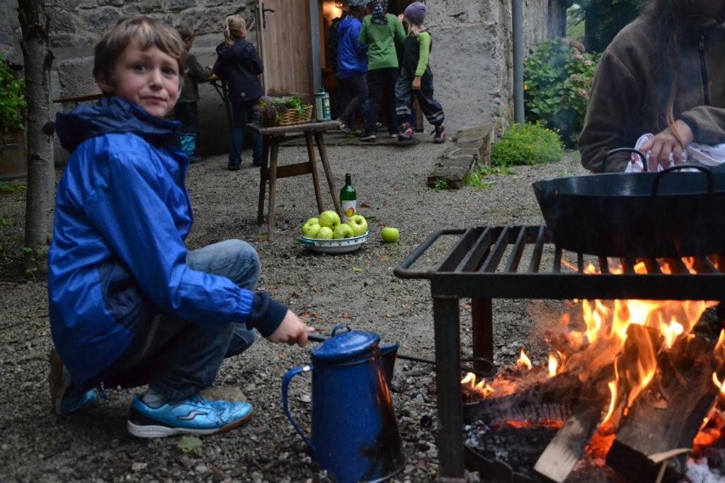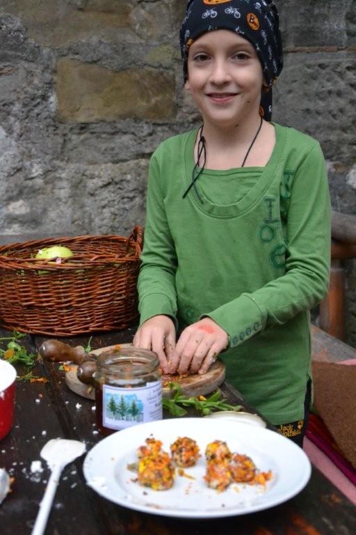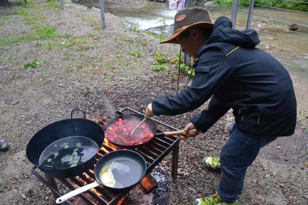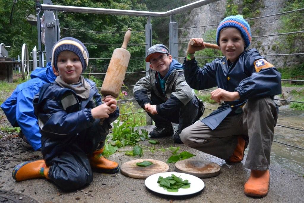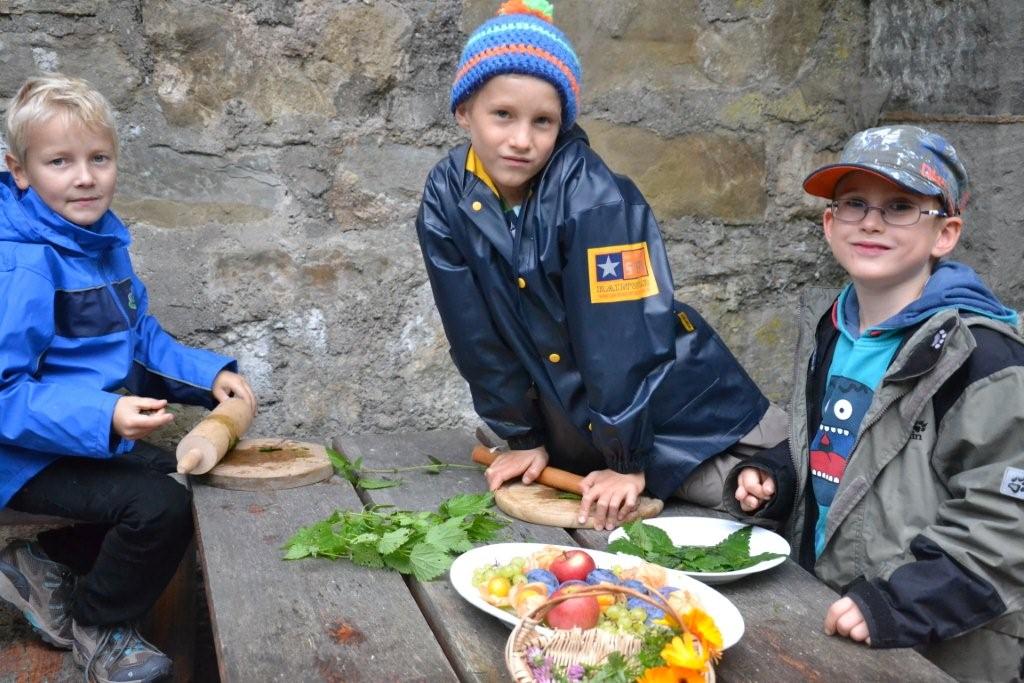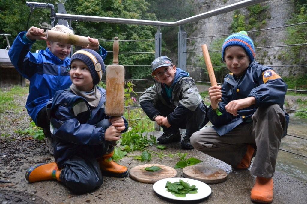 Nachdem wir die gesuchten Pflanzen und Früchte sammelten, begannen wir bei der „Schwarzen Kuchl“ mit der Zubereitung der Speisen am offenen Feuer. Neben einer leckeren Topfencreme mit Holler-Zwetschgen-Apfelröster und süßen Frischkäsebällchen mit Blütenkruste waren vor allem die Brennnesselchips der Renner bei den Kindern!
