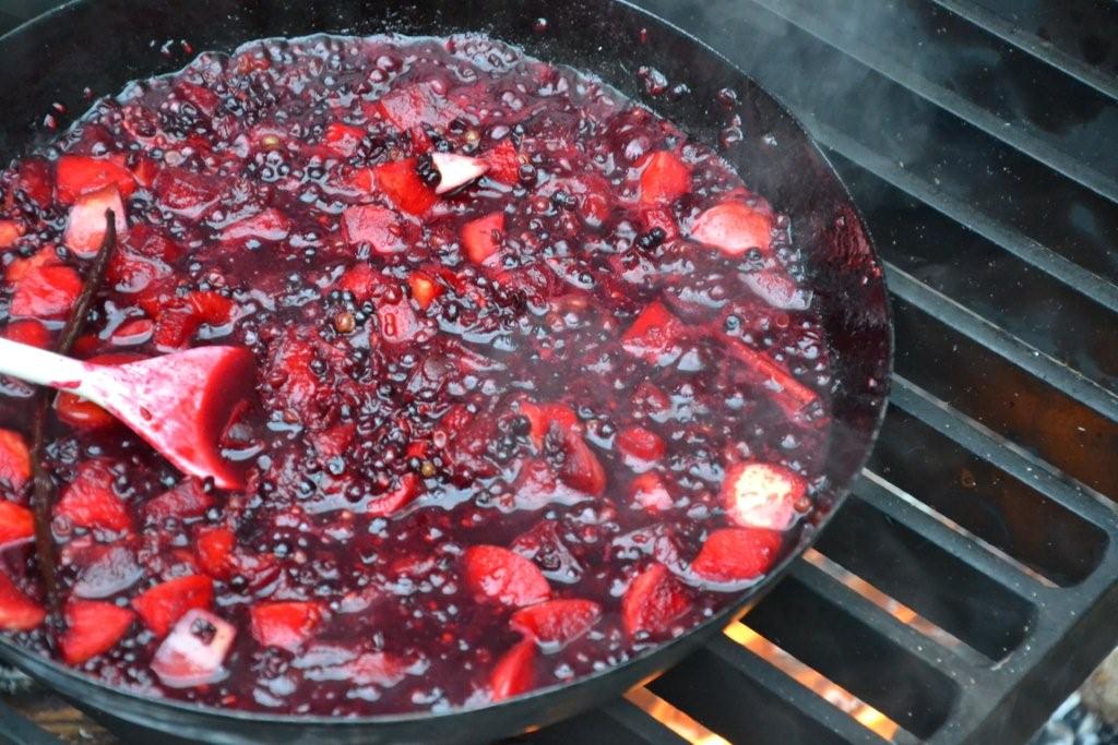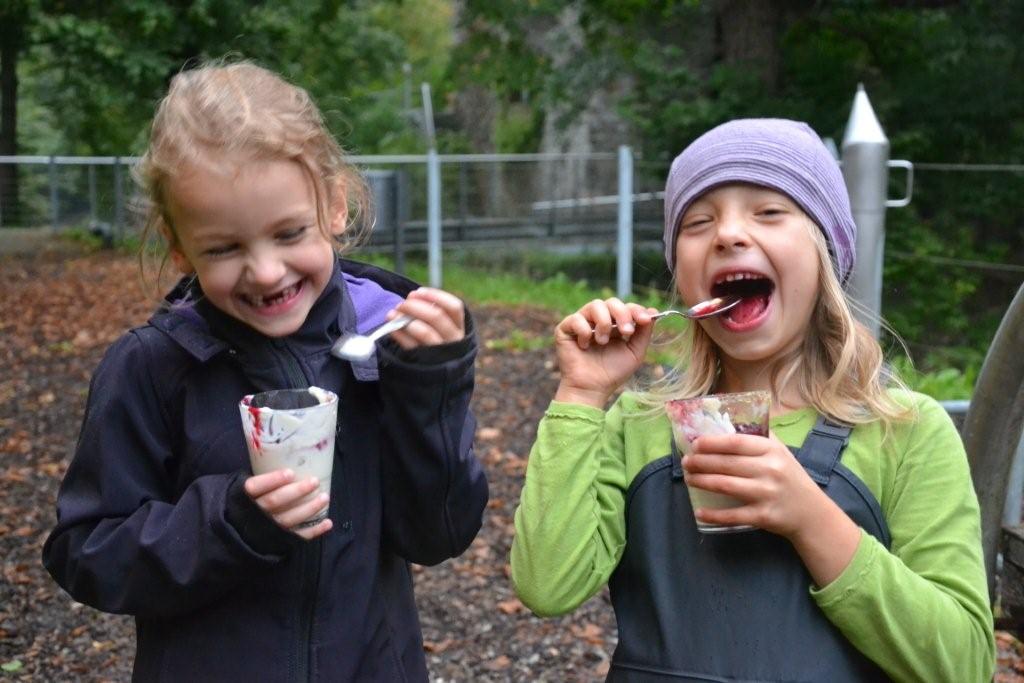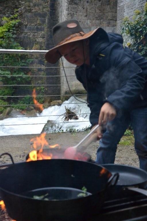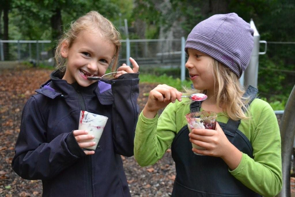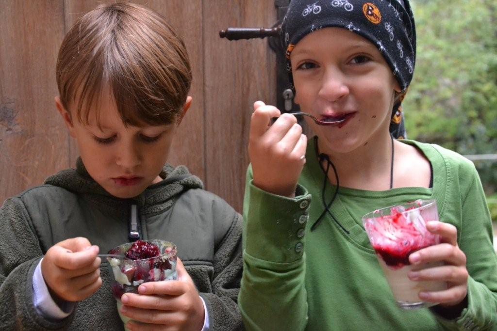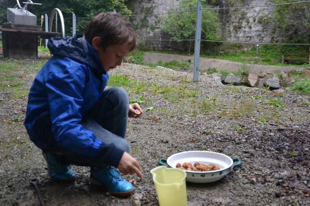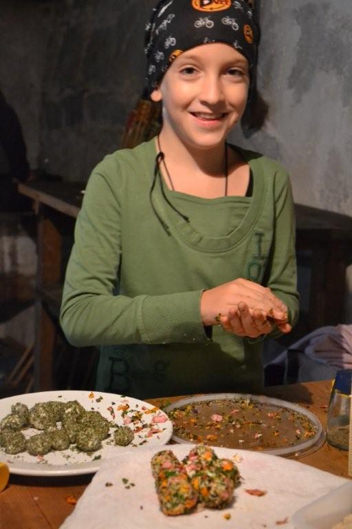 Nachdem wir die gesuchten Pflanzen und Früchte sammelten, begannen wir bei der „Schwarzen Kuchl“ mit der Zubereitung der Speisen am offenen Feuer. Neben einer leckeren Topfencreme mit Holler-Zwetschgen-Apfelröster und süßen Frischkäsebällchen mit Blütenkruste waren vor allem die Brennnesselchips der Renner bei den Kindern!