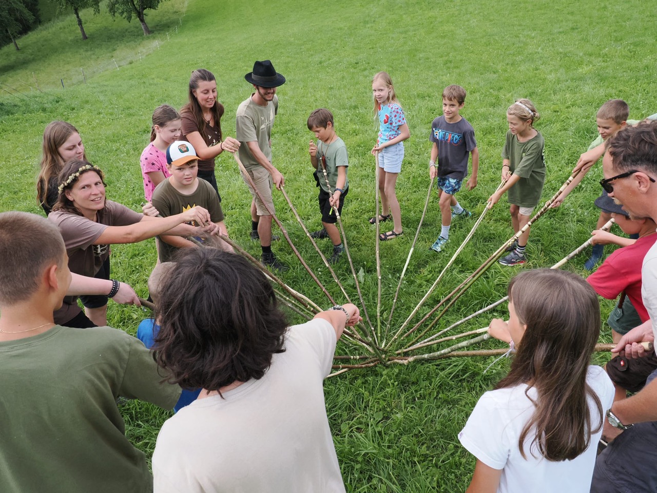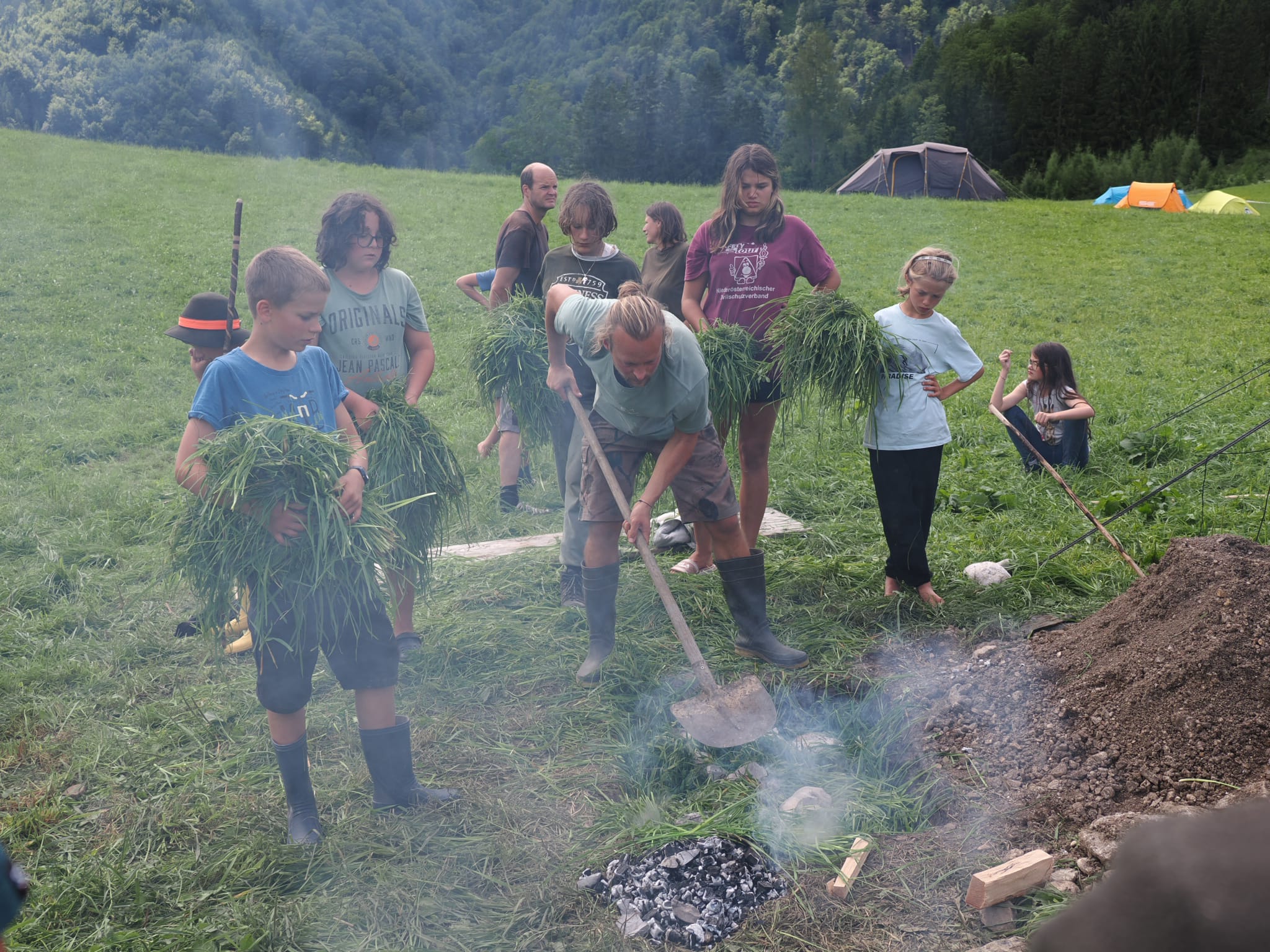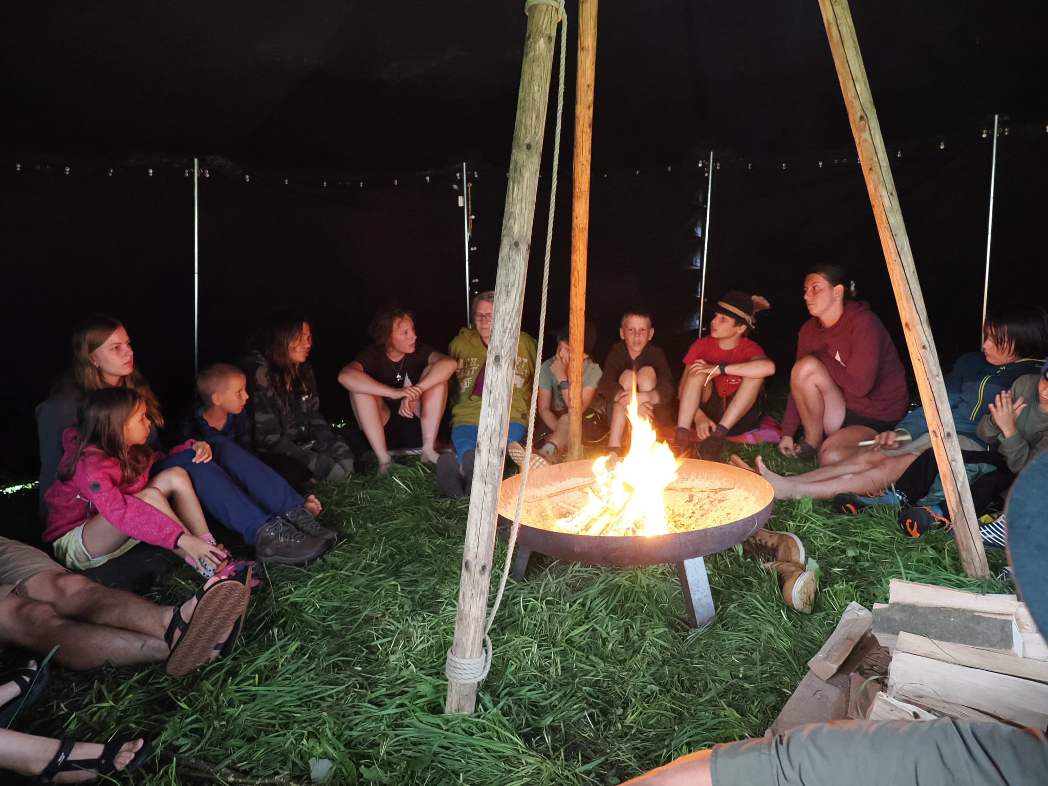 Dann wurden die Zelte aufgeschlagen; Wir schliefen eine ganze Woche im Zelt oder unter freien Himmel und verbrachten eine unvergessliche gemeinsame Zeit. Im Vordergrund dieser Sommerwoche standen Naturverbindung, echte Gemeinschaft erleben, Neues ausprobieren und Spaß. Das abwechslungsreiche Programm reichte von Töpfern am Lagerfeuer, schnitzen, gemeinsames Kochen, Feuer machen mit traditionellen Methoden, Geländespiele, filzen und vieles mehr. In diesem riesigen spielerischen Lernfeld konnten die Kinder über sich hinauswachsen, bestehende Freundschaften wurden gestärkt und neue geknüpft und wahre Verbundenheit zur Natur gelebt.