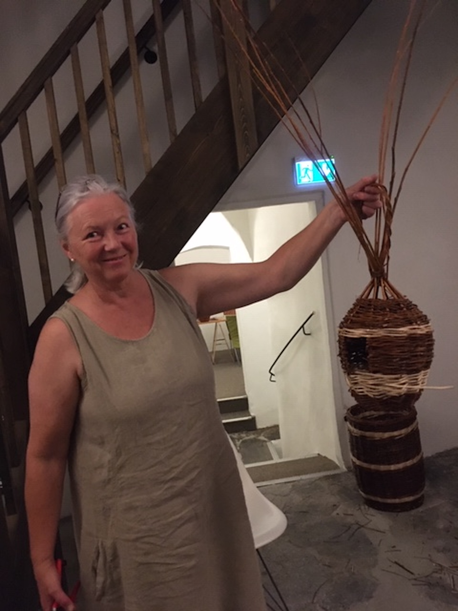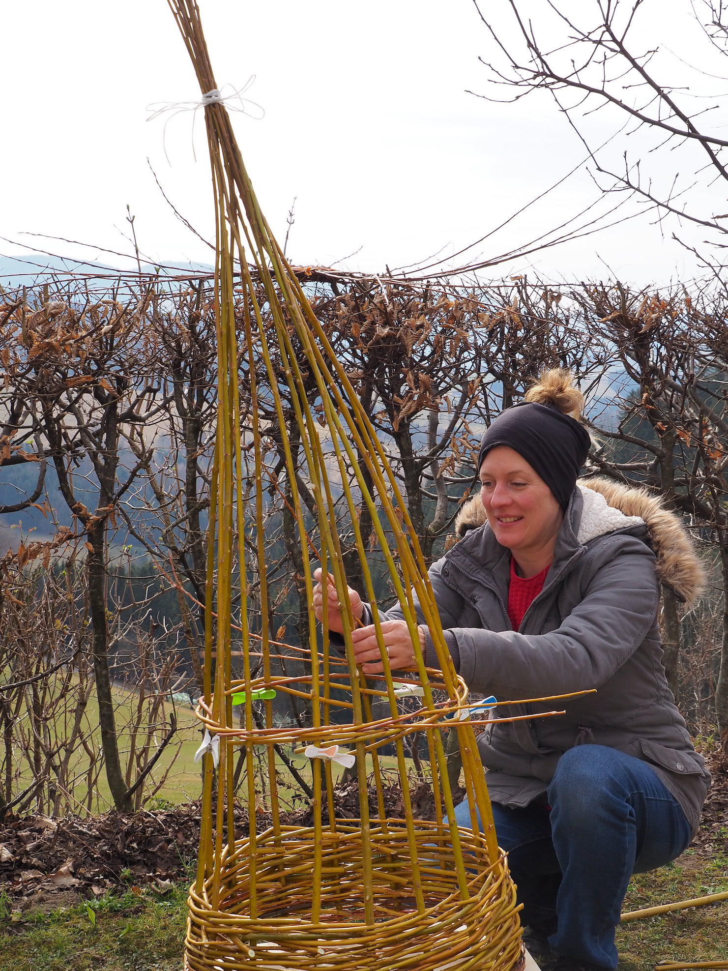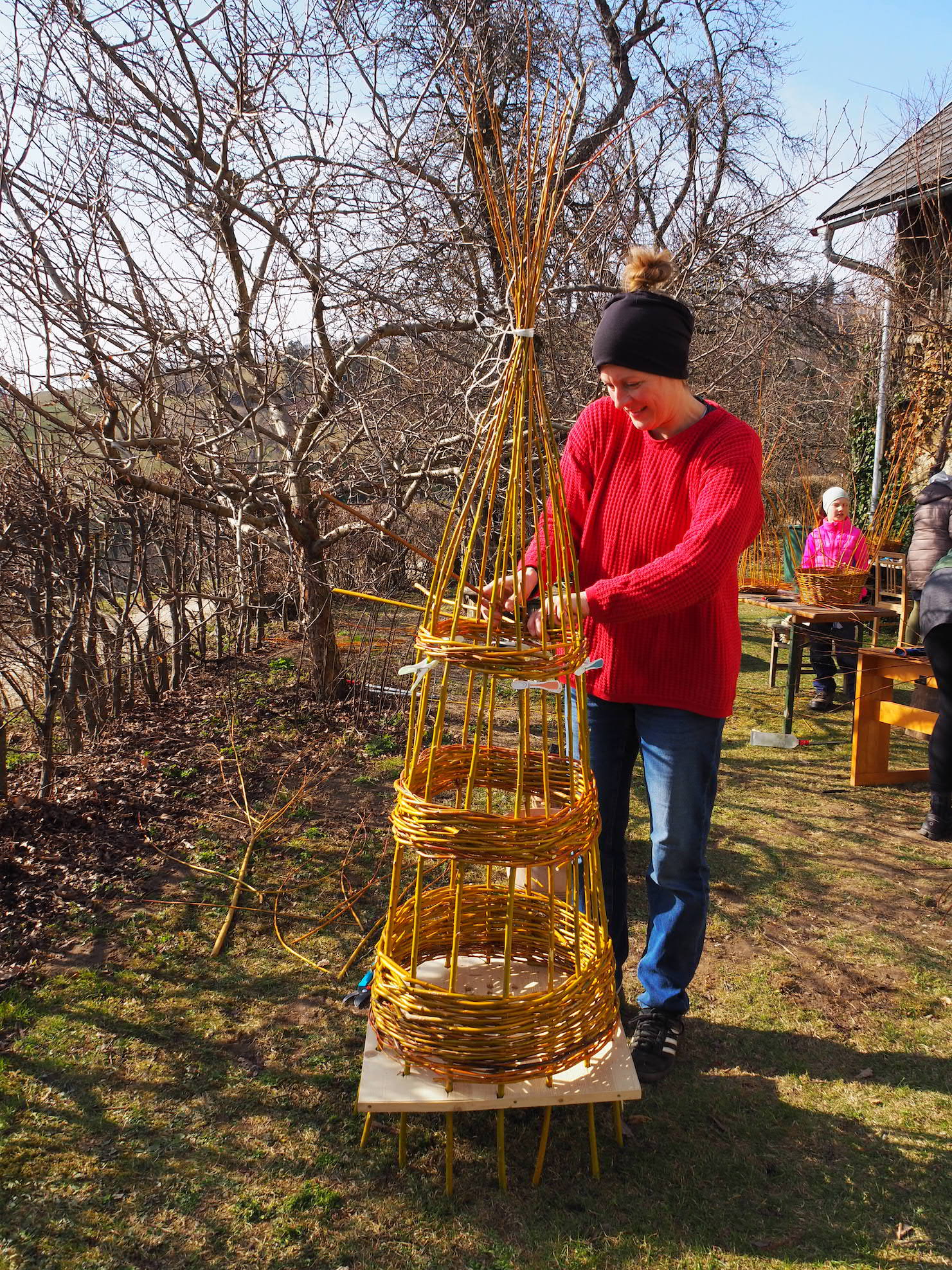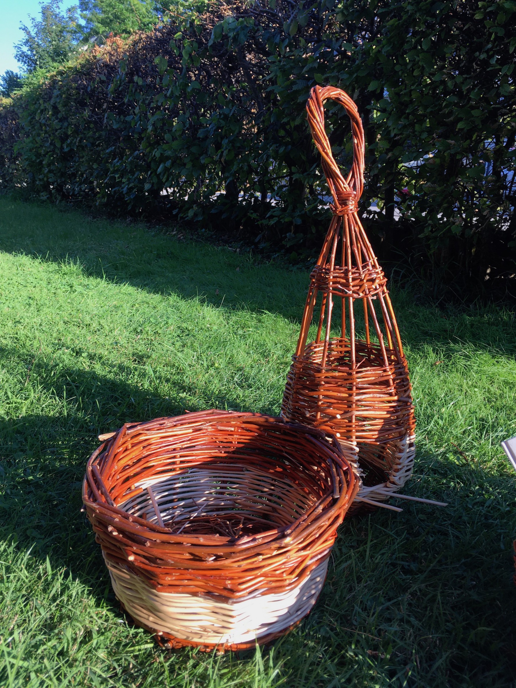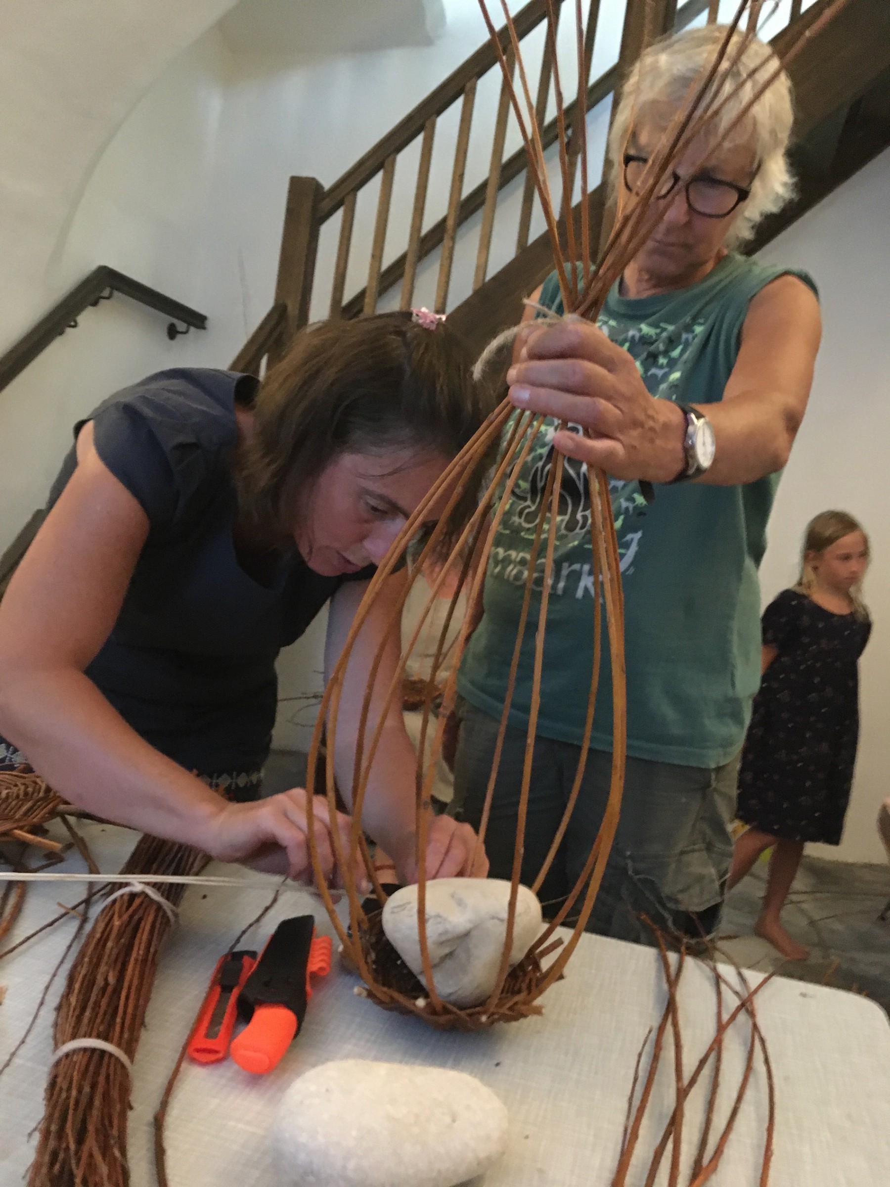 Die beiden Korbflechterinnen Doris und Regina zeigten in der spür.sinn Werkstatt Kreativ wie aus getrockneten Weidenruten einfach ein Vogelhäuschen geflochten wird.